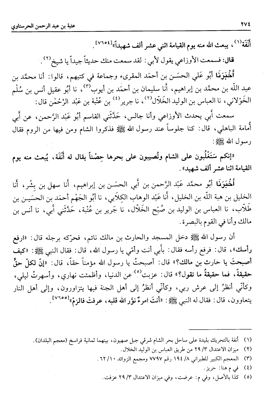 [7654] قال فسمعت الأوزاعي يقول لأبي لقد سمعت منك حديثا جيدا يا شيخ (2) أخبرنا أبو علي الحسن بن أحمد المقرئ وجماعة في كتبهم قالوا أنا محمد بن عبد الله بن محمد بن إبراهيم أنا سليمان بن أحمد بن أيوب (3) نا أبو عقيل أنس بن سلم الخولاني نا العباس بن الوليد الخلال (2) نا جرير (4) بن عتبة بن عبد الرحمن قال سمعت أبي يحدث الأوزاعي وأنا جالس حدثني القاسم أبو عبد الرحمن عن أبي أمامة الباهلي قال كنا جلوسا عند رسول الله (صلى الله عليه وسلم) فذكروا الشام ومن فيها من الروم فقال رسول الله (صلى الله عليه وسلم) إنكم ستغلبون على الشام وتصيبون على بحرها حصنا يقال له أنفة يبعث مه يوم القيامة إثنا عشر ألف شهيد أخبرنا أبو محمد عبد الرحمن بن أبي الحسن بن إبراهيم أنا سهل بن بشر أنا الخليل بن هبة الله بن الخليل أنا عبد الوهاب الكلابي نا أبو الجهم أحمد بن الحسين بن طلاب نا العباس بن الوليد بن صبح الخلال نا جرير بن عتبة حدثني أبي أنا أنس بن مالك وأنا في القوم بالبصرة أن رسول الله (صلى الله عليه وسلم) دخل المسجد والحارث بن مالك نائم فحركه برجله قال ارفع رأسك قال فرفع رأسه فقال بأبي أنت وأمي يا رسول الله قال فقال النبي (صلى الله عليه وسلم) كيف أصبحت يا حارث بن مالك قال أصبحت يا رسول الله مؤمنا حقا قال إن لكل حق حقيقة فما حقيقة ما تقول قال عزبت (5) عن الدنيا وأظمئت نهاري وأسهرت ليلي وكأني أنظر إلى عرش ربي وكأني أنظر إلى أهل الجنة فيها يتزاورون وإلى أهل النار يتعاوون قال فقال له النبي (صلى الله عليه وسلم) أنت امرء نور الله قلبه عرفت فالزم