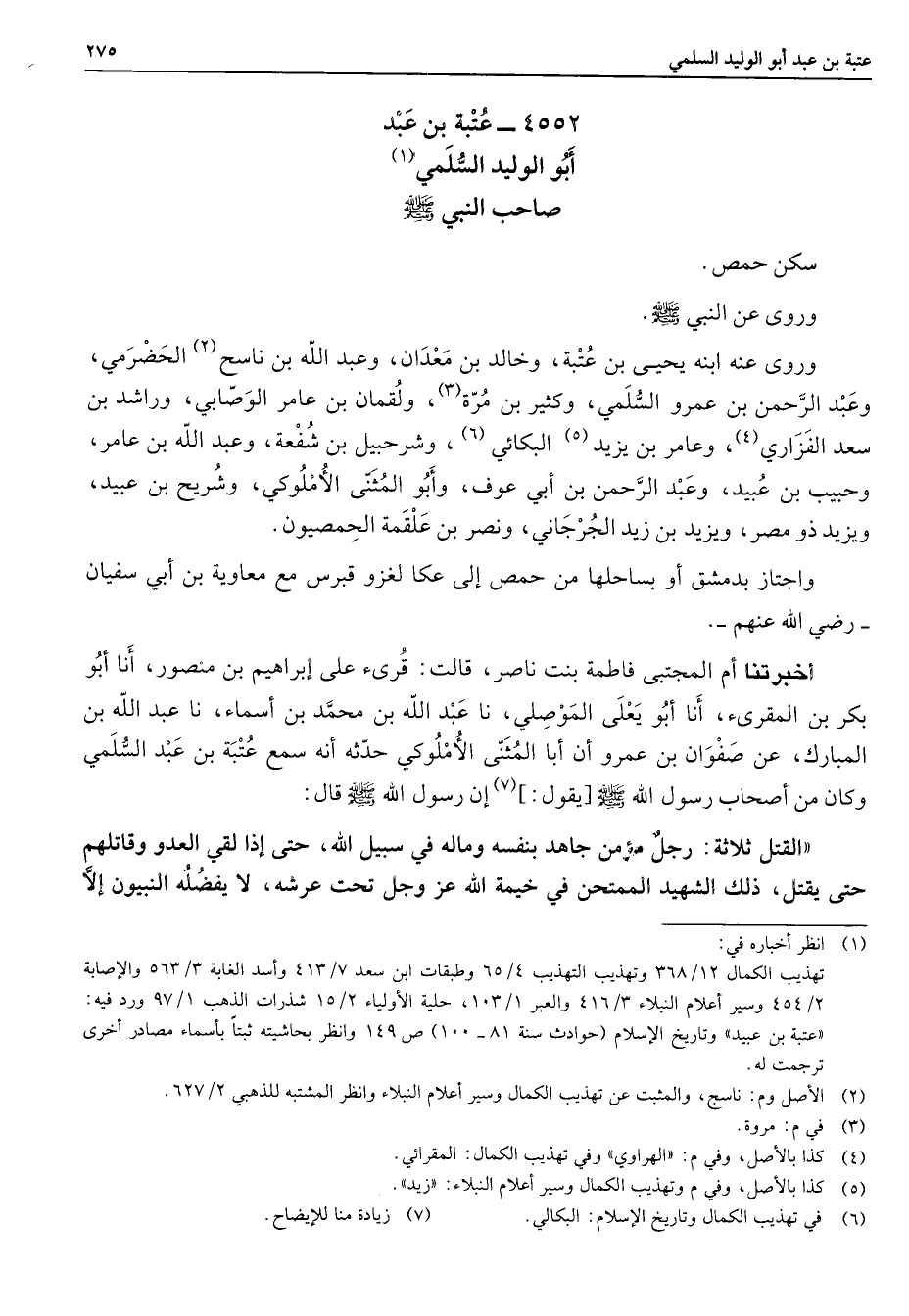 4552 - عتبة بن عبد أبو الوليد السلمي (1) صاحب النبي (صلى الله عليه وسلم) حمص وروى عن النبي (صلى الله عليه وسلم) وروى عنه ابنه يحيى بن عتبة وخالد بن معدان وعبد الله بن ناسح (2) الحضرمي وعبد الرحمن بن عمرو السلمي وكثير بن مرة (3) ولقمان بن عامر الصابي وراشد بن سعد الفزاري (4) وعامر بن يزيد (5) البكائي (6) وشرحبيل بن شفعة وعبد الله بن عامر وحبيب بن عبيد وعبد الرحمن بن أبي عوف وأبو المثنى الأملوكي وشريح بن عبيد ويزيد ذو مصر ويزيد بن زيد الجرجاني ونصر بن علقمة الحمصيون واجتاز بدمشق أو بساحلها من حمص إلى عكا لغزو قبرس مع معاوية بن أبي سفيان Bهم أخبرتنا أم المجتبى فاطمة بنت ناصر قالت قرئ على إبراهيم بن منصور أنا أبو بكر بن المقرئ أنا أبو يعلى الموصلي نا عبد الله بن محمد بن أسماء نا عبد الله بن المبارك عن صفوان بن عمرو أن أبا المثنى الأملوكي حدثه أنه سمع عتبة بن عبد السلمي وكان من أصحاب رسول الله (صلى الله عليه وسلم) يقول (7) إن رسول الله (صلى الله عليه وسلم) قال القتل ثلاثة رجل مؤمن جاهد بنفسه وماله في سبيل الله حتى إذا لقي العدو وقاتلهم حتى يقتل ذلك الشهيد الممتحن في خيمة الله عز وجل تحت عرشه لا يفضله النبيون إلا