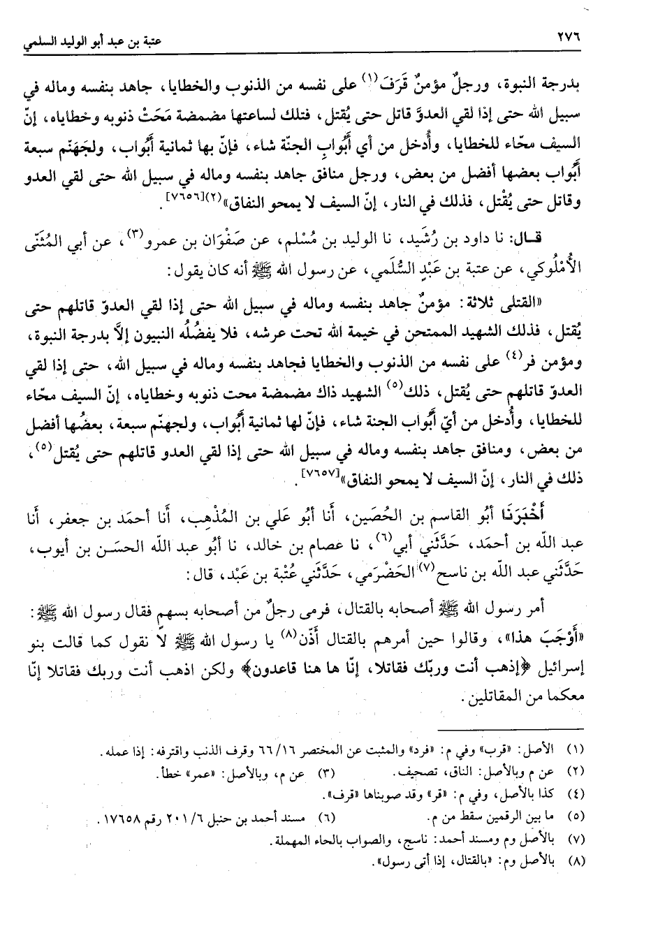 [7656] قال نا داود بن رشيد نا الوليد بن مسلم عن صفوان بن عمرو (3) عن أبي المثنى الأملوكي عن عتبة بن عبد السلمي عن رسول الله (صلى الله عليه وسلم) أنه كان يقول القتلى ثلاثة مؤمن جاهد بنفسه وماله في سبيل الله حتى إذا لقي العدو قاتلهم حتى يقتل فذلك الشهيد الممتحن في خيمة الله تحت عرشه فلا يفضله النبيون إلا بدرجة النبوة ومؤمن فر (4) على نفسه من الذنوب والخطايا فجاهد بنفسه وماله في سبيل الله حتى إذا لقي العدو قاتلهم حتى يقتل ذلك (5) الشهيد ذاك مضمضة محت ذنوبه وخطاياه إن السيف محاء للخطايا وأدخل من أي أبواب الجنة شاء فإن لها ثمانية أبواب ولجنهم سبعة بعضها أفضل من بعض ومنافق جاهد بنفسه وماله في سبيل الله حتى إذا لقي العدو قاتلهم حتى يقتل (5) ذلك في النار إن السيف لا يمحوا النفاق