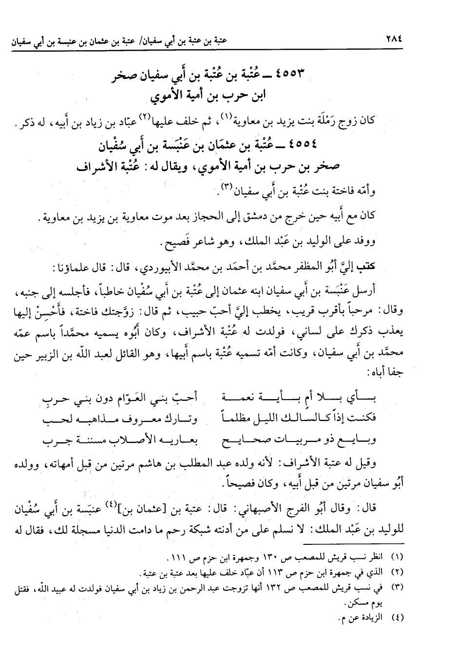 4553 - عتبة بن عتبة بن أبي سفيان صخر ابن حرب بن أمية الأموي كان زوج رملة بنت يزيد بن معاوية (2) ثم خلف عليها (2) عبا بن زياد بن أبيه له ذكر 4554 - عتبة بن عثمان بن عنبسة بن أبي سفيان صخر بن حرب بن أمية الأموي ويقال له عتبة الأشراف وأمه فاختة بنت عتبة بن أبي سفيان (3) كان مع أبيه حين خرج من دمشق إلى الحجاز بعد موت معاوية بن يزيد بن معاوية ووفد على الوليد بن عبد الملك وهو شاعر فصيح كتب إلي أبو المظفر محمد بن أحمد بن محمد الأبيوردي قال قال علماؤنا أرسل عنبسة بن أبي سفيان ابنه عثمان إلى عتبة بن أبي سفيان خاطبا فأجلسه إلى جنبه وقال مرحبا بأقرب قريب يخطب إلي أحب حبيب ثم قال زوجتك فاختة فأحسن إليها يعذب ذكرك على لساني فولدت له عتبة الأشراف وكان أبوه يسميه محمدا بإسم عمه محمد بن أبي سفيان وكانت أمه تسميه عتبة بإسم أبيها وهو القائل لعبد الله بن الزبير حين جفا أباه * باي بلا أم بأية نعمة * أحب بني العوام دون بني حرب فكنت إذا كالسالك الليل مظلما * وتارك معروف مذاهبه لحب وبايع ذو مربيات صحايح * بعاريه الأصلاب مسننة جرب * وقيل له عتبة الأشراف لأنه ولده عبد المطلب بن هاشم مرتين من قبل أمهاته وولده أبو سفيان مرتين من قبل أبيه وكان فصيحا قال وقال أبو الفرج الأصبهاني قال عتبة بن عثمان (4) بن عنبسة بن أبي سفيان للوليد بن عبد الملك لا نسلم على من أدنته شبكة رحم ما دامت الدنيا مسجلة لك فقال له