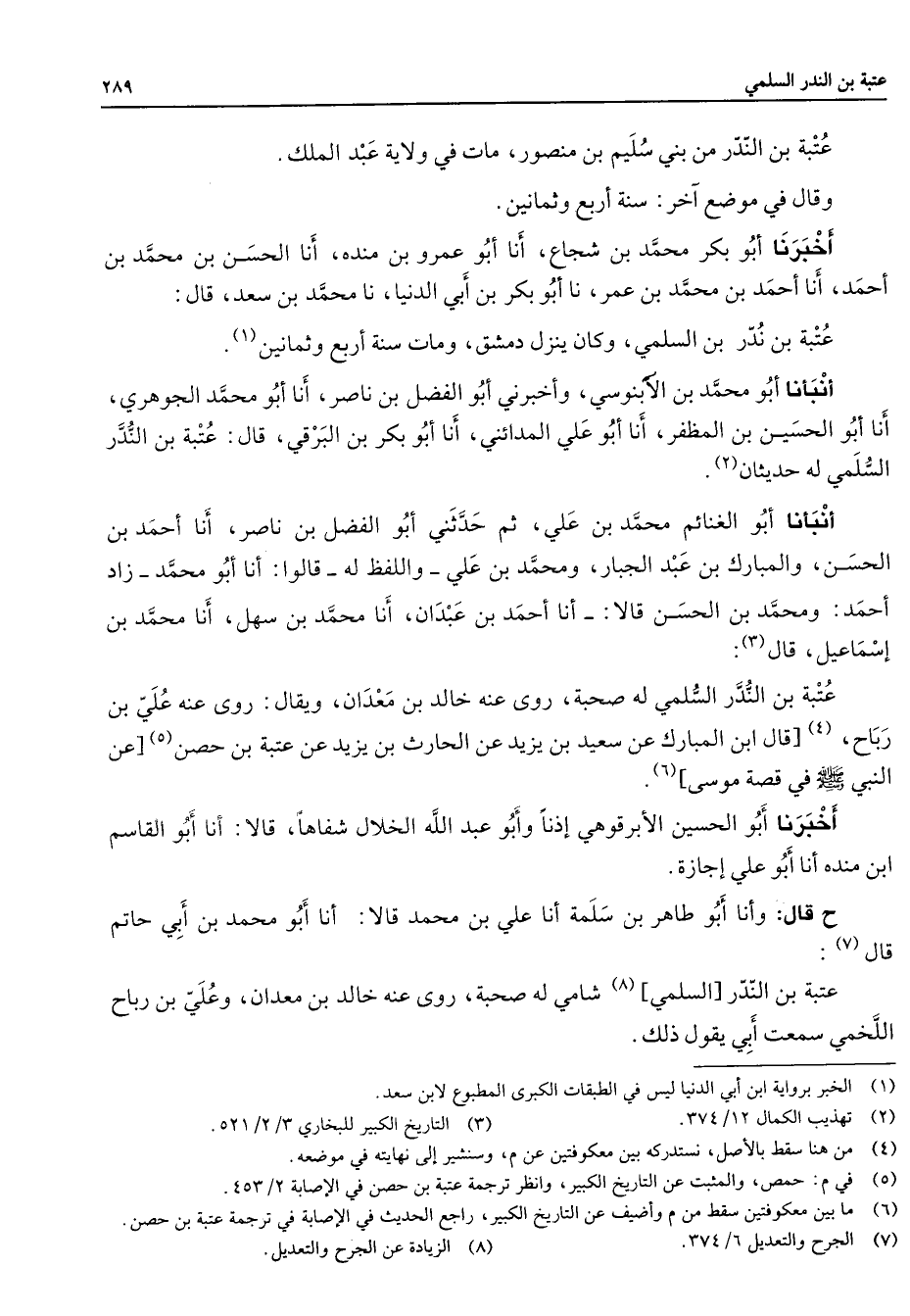 عتبة بن الندر من بني سليم بن منصور مات في ولاية عبد الملك وقال في موضع آخر سنة أربع وثمانين أخبرنا أبو بكر محمد بن شجاع أنا أبو عمرو بن منده أنا الحسن بن محمد بن أحمد أنا أحمد بن محمد بن عمر نا أبو بكر بن أبي الدنيا أنا محمد بن سعد قال عتبة بن ندر بن السلمي وكان ينزل دمشق ومات سنة أربع وثمانين (1) أنبأنا أبو محمد بن الآبنوسي وأخبرني أبو الفضل بن ناصر أنا أبو محمد الجوهري أنا أبو الحسين بن المظفر أنا أبو علي المدائني أنا أبو بكر بن البرقي قال عتبة بن الندر السلمي له حديثان (2) أنبأنا أبو الغنائم محمد بن علي ثم حدثني أبو الفضل بن ناصر أنا أحمد بن الحسن والمبارك بن عبد الجبار ومحمد بن علي واللفظ له قالوا أنا أبو محمد زاد أحمد ومحمد بن الحسن قالا أنا أحمد بن عبدان أنا محمد بن سهل أنا محمد بن إسماعيل قال (3) عتبة بن الندر السلمي له صحبة روى عنه خالد بن معدان ويقال روى عنه علي بن رباح (4) قال ابن المبارك عن سعيد بن يزيد عن الحارث بن يزيد عن عتبة بن حصن (5) عن النبي (صلى الله عليه وسلم) في قصة موسى (6) أخبرنا أبو الحسين الأبرقوهي إذنا وأبو عبد الله الخلال شفاها قالا أنا أبو القاسم ابن منده أنا أبو علي إجازة ح قال وأنا أبو طاهر بن سلمة أنا علي بن محمد قالا أنا أبو محمد بن أبي حاتم قال (7) عتبة بن الندر السلمي (8) شامي له صحبة روى عنه خالد بن معدان وعلي بن رباح اللخمي سمعت أبي يقول ذلك