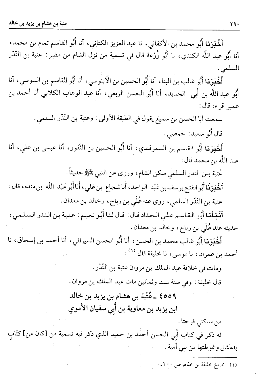 أخبرنا أبو محمد بن الأكفاني نا عبد العزيز الكتاني أنا أبو القاسم تمام بن محمد أنا أبو عبد الله الكندي نا أبو زرعة قال في تسمية من نزل الشام من مضر عتبة بن الندر السلمي أخبرنا أبو غالب بن البنا أنا أبو الحسين بن الآبنوسي أنا أبو القاسم بن السوسي أنا أبو عبد الله بن أبي الحديد أنا أبو الحسن الربعي أنا عبد الوهاب الكلابي أنا أحمد بن عمير قراءة قال سمعت أبا الحسن بن سميع يقول في الطبقة الأولى وعتبة بن الندر السلمي قال أبو سعيد حمصي أخبرنا أبو القاسم بن السمرقندي أنا أبو الحسين بن النقور أنا عيسى بن علي أنا عبد الله بن محمد قال عتبة بن الندر السلمي سكن الشام وروى عن النبي (صلى الله عليه وسلم) حديثا أخبرنا أبو الفتح يوسف بن عبد الواحد أنا شجاع بن علي أنا أبو عبد الله بن منده قال عتبة بن الندر السلمي روى عنه علي بن رباح وخالد بن معدان أنبأنا أبو القاسم علي الحداد قال قال لنا أبو نعيم عتبة بن الندر السلمي حديثه عند علي بن رباح وخالد بن معدان أخبرنا أبو غالب محمد بن الحسن أنا أبو الحسن السيرافي أنا أحمد بن إسحاق نا أحمد بن عمران نا موسى نا خليفة قال (1) ومات في خلافة عبد الملك بن مروان عتبة بن الندر قال خليفة وفي سنة ست وثمانين مات عبد الملك بن مروان 4559 - عتبة بن هشام بن يزيد بن خالد ابن يزيد بن معاوية بن أبي سفيان الأموي من ساكني قرحتا له ذكر في كتاب أبي الحسن أحمد بن حميد الذي ذكر فيه تسمية من كان من كتاب بدمشق وغوطتها من بني أمية