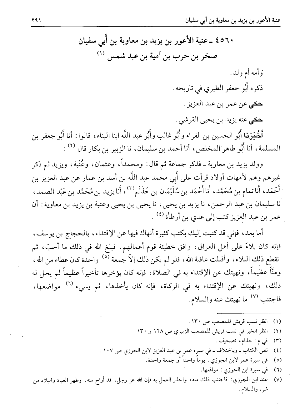4560 - عتبة الأعور بن يزيد بن معاوية بن أبي سفيان صخر بن حرب بن أمية بن عبد شمس (1) وأمه أم ولد ذكره أبو جعفر الطبري في تاريخه حكى عن عمر بن عبد العزيز حكى عنه يزيد بن يحيى القرشي أخبرنا أبو الحسين بن الفراء وأبو غالب وأبو عبد الله ابنا البناء قالوا أنا أبو جعفر بن المسلمة أنا أبو طاهر المخلص أنا أحمد بن سليمان نا الزبير بن بكار قال (2) وولد يزيد بن معاوية فذكر جمعة ثم قال ومحمدا وعثمان وعتبة ويزيد ثم ذكر غيرهم وهم لأمهات أولاد قرأت على أبي محمد عبد الله بن أسد بن عمار عن عبد العزيز بن أحمد أنا تمام بن محمد أنا أحمد بن سليمان بن حذلم (3) أنا يزيد بن محمد بن عبد الصمد نا سليمان بن عبد الرحمن نا يزيد بن يحيى نا يحيى بن يحيى وعتبة بن يزيد بن معاوية أن عمر بن عبد العزيز كتب إلى عدي بن أرطأة (4) أما بعد فإني قد كتبت إليك بكتب كثيرة أنهاك فيها عن الإقتداء بالحجاج بن يوسف فإنه كان بلاء على أهل العراق وافق خطيئة قوم أعمالهم فبلغ الله في ذلك ما أحب ثم انقطع ذلك البلاء وأقبلت عافية الله فلو لم يكن ذلك إلا جمعة (5) واحدة كان عطاء من الله ومنا عظيما ونهيتك عن الإقتداء به في الصلاة فإنه كان يؤخرها تأخيرا عظيما لم يحل له ذلك ونهيتك عن الإقتداء به في الزكاة فإنه كان يأخذها ثم يسئ (6) مواضعها فاجتنب (7) ما نهيتك عنه والسلام