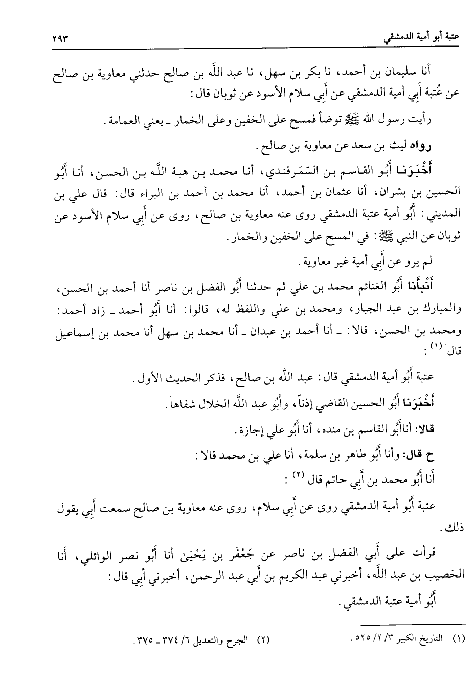 أنا سليمان بن أحمد نا بكر بن سهل نا عبد الله بن صالح حدثني معاوية بن صالح عن عتبة بن أمية الدمشقي عن أبي سلام الأسود عن ثوبان قال رأيت رسول الله (صلى الله عليه وسلم) توضأ فمسح على الخفين وعلى الخمار يعني العمامة رواه ليث بن سعد عن معاوية بن صالح أخبرنا أبو القاسم بن السمرقندي أنا محمد بن هبة الله بن الحسن أنا أبو الحسين بن بشران أنا عثمان بن أحمد أنا محمد بن أحمد بن البراء قال قال علي بن المديني أبو أمية عتبة الدمشقي روى عنه معاوية بن صالح روى عن أبي سلام الأسود عن ثوبان عن النبي (صلى الله عليه وسلم) في المسح على الخفين والخمار لم يرو عن أبي أمية غير معاوية أنبأنا أبو الغنائم محمد بن علي ثم حدثنا أبو الفضل بن ناصر أنا أحمد بن الحسن والمبارك بن عبد الجبار ومحمد بن علي واللفظ له قالوا أنا أبو أحمد زاد أحمد ومحمد بن الحسن قالا أنا أحمد بن عبدان أنا محمد بن سهل أنا محمد بن إسماعيل قال (1) عتبة أبو أمية الدمشقي قال عبد الله بن صالح فذكر الحديث الأول أخبرنا أبو الحسين القاضي إذنا وأبو عبد الله الخلال شفاها قالا أنا أبو القاسم بن منده أنا أبو علي إجازة ح قال وأنا أبو طاهر بن سلمة أنا علي بن محمد قالا أنا أبو محمد بن أبي حاتم قال (2) عتبة أبو أمية الدمشقي روى عن أبي سلام روى عنه معاوية بن صالح سمعت أبي يقول ذلك قرأت على أبي الفضل بن ناصر عن جعفر بن يحيى أنا أبو نصر الوائلي أنا الخصيب بن عبد الله أخبرني عبد الكريم بن أبي عبد الرحمن أخبرني أبي قال أبو أمية عتبة الدمشقي