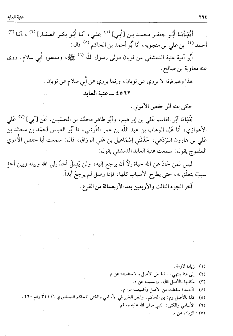 أنبأنا أبو جعفر محمد بن أبي (1) علي أنا أبو بكر الصفار (2) أنا (3) أحمد (4) بن علي بن منجويه أنا أبو أحمد بن الحاكم (5) قال أبو أمية عتبة الدمشقي عن ثوبان مولى رسول الله (6) (صلى الله عليه وسلم) وممطور أبي سلام روى عنه معاوية بن صالح هذا وهم فإنه لا يروي عن ثوبان وإنما يروي عن أبي سلام عن ثوبان 4562 - عتبة العابد حكى عنه أبو حفص الأموي أنبأنا أبو القاسم علي بن إبراهيم وأبو طاهر محمد بن الحسين عن أبي (7) علي الأهوازي أنا عبد الوهاب بن عبد الله بن عمر القرشي نا أبو العباس أحمد بن محمد بن علي بن هارون البردعي حدثني إسماعيل بن علي الوراق قال سمعت أبا حفص الأموي المفلوج يقول سمعت عتبة العابد الدمشقي يقول ليس لمن حاد عن الله حياة إلا أن يرجع إليه ولن يصل أحد إلى الله وبينه وبين أحد سبب يتعلق به حتى يطرح الأسباب كلها فإذا وصل لم يرجع أبدا آخر الجزء الثالث والأربعين بعد الأربعمائة من الفرع