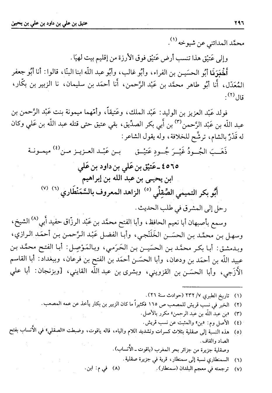 محمد المدائني عن شيوخه (1) وإلى عتيق هذا تنسب أرض عتيق فوق الأرزة من إقليم بيت لهيا أخبرنا أبو الحسين بن الفراء وأبو غالب وأبو عبد الله ابنا البنا قالوا أنا أبو جعفر المعدل أنا أبو طاهر محمد بن عبد الرحمن أنا أحمد بن سليمان نا الزبير بن بكار قال (2) فولد عبد العزيز بن الوليد عبد الملك وعتيقا وأمهما ميمونة بنت عبد الرحمن بن عبد الله بن عبد الرحمن (3) بن أبي بكر الصديق بقي عتيق حتى قتله عبد الله بن علي وكان له قدر بالشام ترشح للخلافة وله يقول الشاعر * ذهب الجود غير جود عتيق * بن عبد العزيز من (4) ميمونة * 4565 - عتيق بن علي بن داود بن علي ابن يحيى بن عبد الله بن إبراهيم أبو بكر التميمي الصقلي (5) الزاهد المعروف بالسمنطاري (6) (7) رحل إلى المشرق في طلب الحديث وسمع بأصبهان أبا نعيم الحافظ وأبا الفتح محمد بن عبد الرزاق حفيد أبي (8) الشيخ وسهل بن محمد بن الحسن الخلنجي وأبا الفضل عبد الرحمن بن أحمد الرازي وبدمشق أبا بكر محمد بن الحسين بن الحرمي وبالموصل أبا الفتح محمد بن عبيد الله بن أحمد بن ودعان وأبا الحسن أحمد بن الفتح بن فرعان وببغداد أبا القاسم الأزجي وأبا الحسن بن القزويني وبشرى بن عبد الله القايني وبزنجان أبا علي