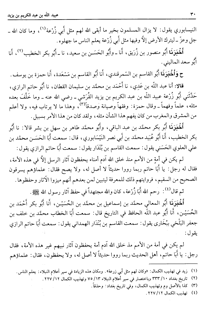 النيسابوري يقول لا يزال المسلمون بخير ما أبقي الله لهم مثل أبي زرعة (1) وما كان الله جل وعز ليترك الأرض إلا وفيها مثل أبي زرعة يعلم الناس ما جهلوه أخبرنا أبو منصور بن زريق أنا وأبو الحسن بن سعيد نا أبو بكر الخطيب (2) أنا أبو سعد الماليني ح وأخبرنا أبو القاسم بن السمرقندي أنا أبو القاسم بن مسعدة أنا حمزة بن يوسف قالا أنا عبد الله بن عدي نا أحمد بن محمد بن سليمان القطان نا أبو حاتم الرازي حدثني أبو زرعة عبيد الله بن عبد الكريم بن يزيد القرشي Bهـ وما خلف بعده مثله علما وفهما وقال حمزة وفقها وصيانة وصدقا (3) وهذا ما لا يرتاب فيه ولا أعلم من المشرق والمغرب من كان يفهم هذا الشأن مثله ولقد كان من هذا الأمر بسبيل أخبرنا أبو بكر بن محمد بن عبد الباقي وأبو محمد طاهر بن سهل بن بشر قالا نا أبو بكر الخطييب أنا أبو عبيد محمد بن أبي نصر النيسابوري قال سمعت أبا الحسن محمد بن علي العلوي الحسني يقول سمعت القاسم بن بندار يقول سمعت أبا حاتم الرازي يقول لم يكن في أمة من الأمم منذ خلق الله آدم أمناء يحفظون آثار الرسل إلا في هذه الأمة فقال له رجل يا أبا حاتم ربما رووا حديثا لا أصل له ولا يصح فقال علماؤهم يسرقون الصحيح من السقيم فروايتهم ذلك للمعرفة ليتبين لمن بعدهم أنهم ميزوا الآثار وحفظوها ثم قال (4) رحم الله أبا زرعة كان والله مجتهدا في حفظ آثار رسول الله (صلى الله عليه وسلم) أخبرنا أبو المعالي محمد بن إسماعيل بن محمد بن الحسين أنا أبو بكر أحمد بن الحسين أنا عبد الله الحافظ في التاريخ قال سمعت أبا الخطاب محمد بن خلف بن جعفر البلخي ببخارى يقول سمعت القاسم بن بندار الهمداني يقول سمعت أبا حاتم الرازي يقول لم يكن في أمة من الأمم مذ خلق الله آدم أمة يحفظون آثار نبيهم غير هذه الأمة فقال رجل يا أبا حاتم أهل الحديث ربما رووا حديثا لا أصل له ولا يحفظون فقال علماؤهم