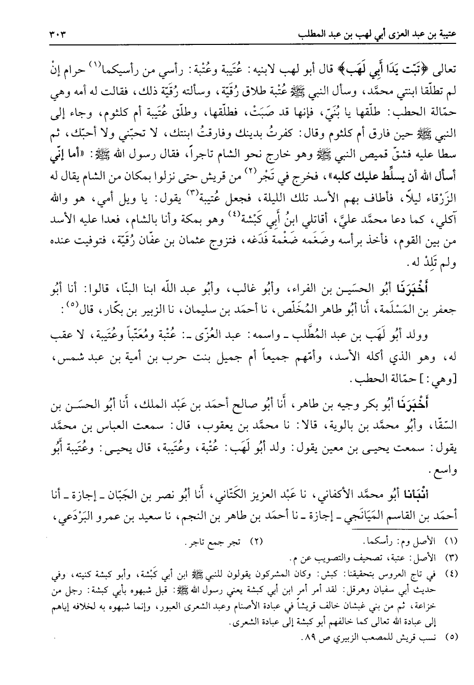 تعالى " تبت يدا أبي لهب " قال أبو لهب لإبنيه عتيبة وعتبة رأسي من رأسيكما (1) حرام إن لم تطلقا ابنتي محمد وسأل النبي (صلى الله عليه وسلم) عتبة طلاق رقية وسألته رقية ذلك فقال له أمه وهي حمالة الحطب طلقها يا بني فإنها قد صبت فطلقها وطلق عتيبة أم كلثوم وجاء إلى النبي (صلى الله عليه وسلم) حين فارق أم كلثوم وقال كفرت بدينك وفارقت أبنتك لا تحبني ولا أحبك ثم سطا عليه فشق قميص النبي (صلى الله عليه وسلم) وهو خارج نحو الشام تاجرا فقال رسول الله (صلى الله عليه وسلم) أما إني أسأل الله أن يسلط عليك كلبه فخرج في تجر (2) من قريش حتى تزلوا بمكان من الشام يقال له الزرقاء ليلا فأطاف بهم الأسد تلك الليلة فجعل عتيبة (3) يقول يا ويل أمي هو والله آكلي كما دعا محمد علي أقاتلي ابن أبي كبشة (4) وهو بمكة وأنا بالشام فعدا عليه الأسد من بين القوم فأخذ برأسه وضغمه ضعمة فدغه فتزوج عثمان بن عفان رقية فتوفيت عند ولم تلد له أخبرنا أبو الحسين بن الفراء وأبو غالب وأبو عبد الله ابنا البنا قالوا أنا أبو جعفر بن المسلمة أنا أبو طاهر المخلص نا أحمد بن سليمان نا الزبير بن بكار قال (5) وولد أبو لهب بن عبد المطلب واسمه عبد العزى عتبة ومعتبا وعتيبة لا عقب له وهو الذي أكله الأسد وأمهم جميعا أم جميل بنت حرب بن أمية بن عبد شمس وهي حمالة الحطب أخبرنا أبو بكر وجيه بن طاهر أنا أبو صالح أحمد بن عبد الملك أنا أبو الحسن بن السقا وأبو محمد بن بالوية قالا نا محمد بن يعقوب قال سمعت العباس بن محمد يقول سمعت يحيى بن معين يقول ولد أبو لهب عتبة وعتيبة قال يحيى وعتيبة أبو واسع أنبأنا أبو محمد الأكفاني نا عبد العزيز الكتاني أنا أبو نصر بن الجبان إجازة أنا أحمد بن القاسم الميانجي إجازة نا أحمد بن طاهر بن النجم نا سعيد بن عمرو البردعي