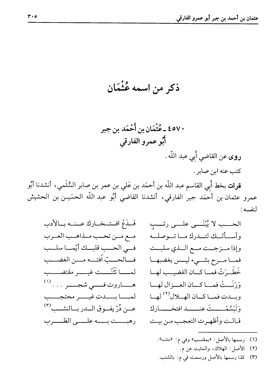 ذكر من اسمه عثمان 4570 - عثمان بن أحمد بن جبر أبو عمرو الفارقي روى عن القاضي أبي عبد الله كتب عنه ابن صابر قرأت بخط أبي القاسم عبد الله بن أحمد بن علي بن عمر بن صابر السلمي أنشدنا أبو عمرو عثمان بن أحمر جبر الفارقي أنشدنا القاضي أبو عبد الله الحسين بن الحشيش لنفسه * الحب لا يبنى على رتب * فدع افتخارك عنه بالأدب وأسألك لتدرك ما توصله * مع من تحب مذاهب العرب وإذا مزجت مع الذي سلبت * في الحب قلبك أيما سلب فما مرح بشئ ليس يغضبها * فالحب آفته من الغضب خطرت فما كان القضيب لها * لما تثنت غير مقتضب ورنت فما كان العزال لها * هاروت في شجر (1) وبدت فما كان الهلال (2) لها * لما بدت غير محتجب وتبسمت عند افتخارك * عن در يفوق الدر بالنشب (3) قالت وأظهرت التعجب من بيت * رهبت به على الظرب