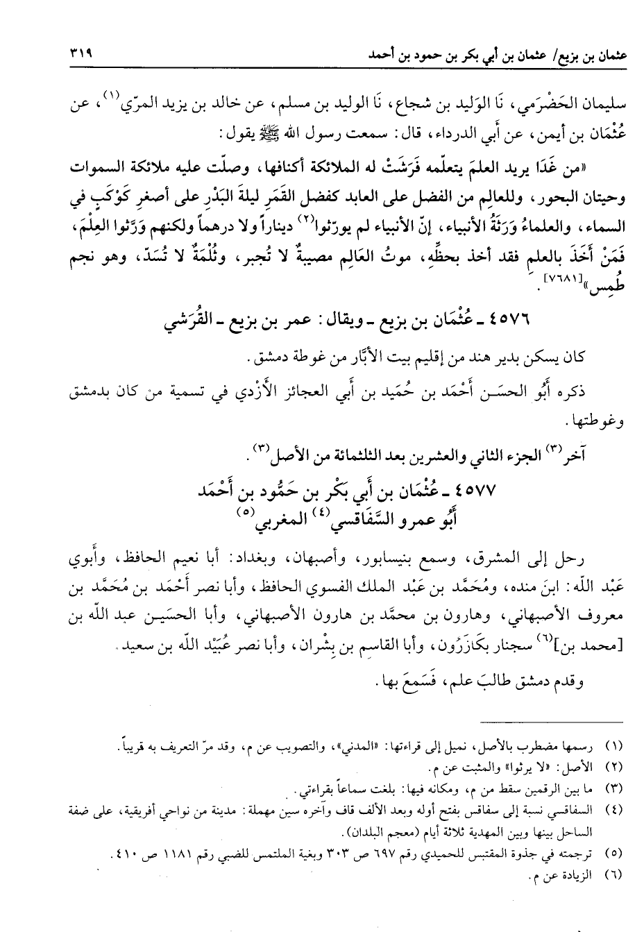 4577 - عثمان بن أبي بكر بن حمود بن أحمد أبو عمرو السفاقسي (4) المغربي (5) رحل إلى المشرق وسمع بنيسابور وأصبهان وبغداد أبا نعيم الحافظ وأبوي عبد الله ابن منده ومحمد بن عبد الملك الفسوي الحافظ وأبا نصر أحمد بن محمد بن معروف الأصبهاني وهارون بن محمد بن هارون الأصبهاني وأبا الحسين عبد الله بن محمد بن سجنار بكازرون وأبا القاسم بن بشران وأبا نصر عبيد الله بن سعيد وقدم دمشق طالب علم فسمع بها