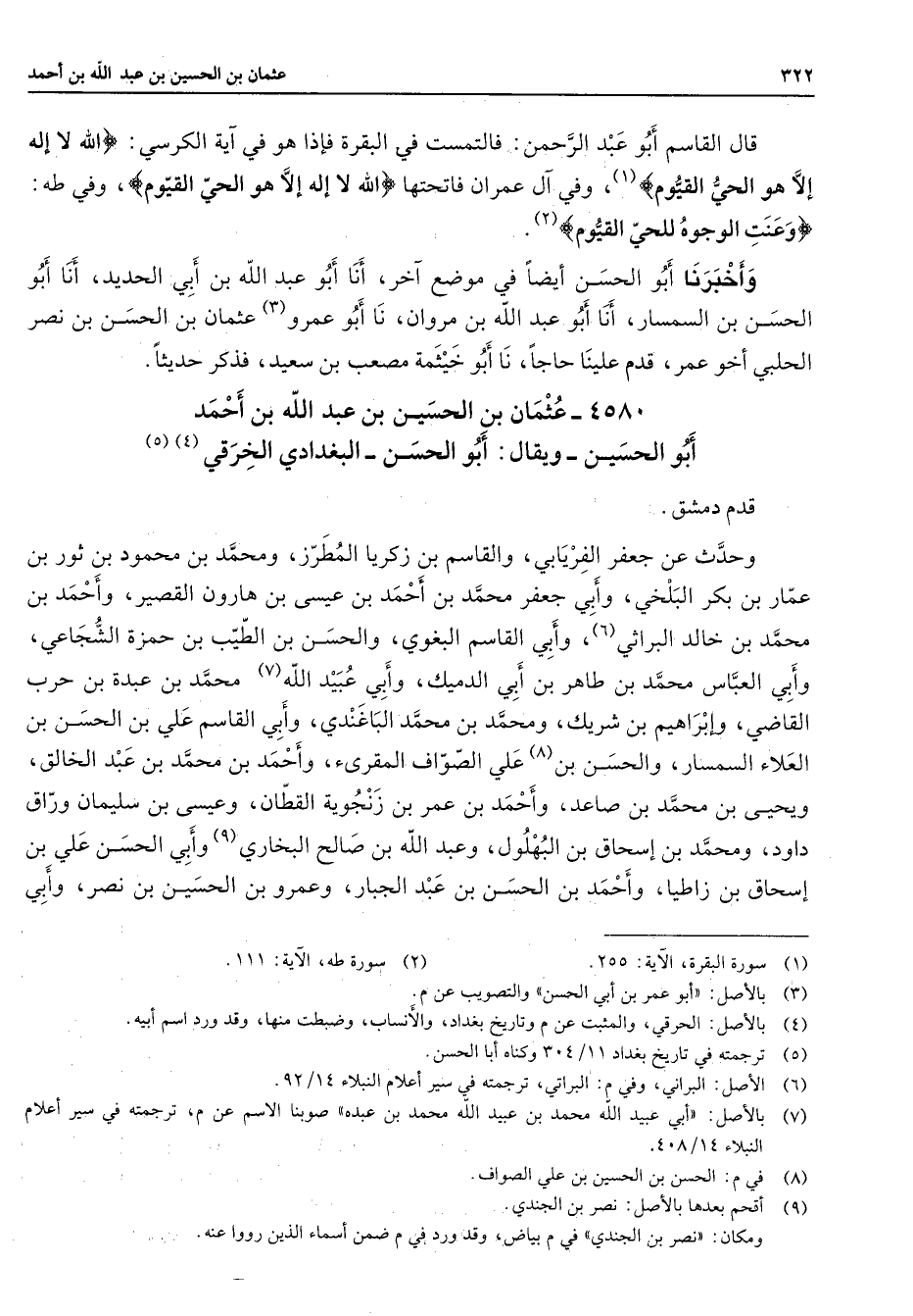 4580 - عثمان بن الحسين بن عبد الله بن أحمد أبو الحسين ويقال أبو الحسن البغدادي الخرقي (4) (5) قدم دمشق وحدث عن جعفر الفريابي والقاسم بن زكريا المطرز ومحمد بن محمود بن ثور بن عمار بن بكر البلخي وأبي جعفر محمد بن أحمد بن عيسى بن هارون القصير وأحمد بن محمد بن خالد البراثي (6) وأبي القاسم البغوي والحسن بن الطيب بن حمزة الشجاعي وأبي العباس محمد بن طاهر بن أبي الدميك وأبي عبيد الله (7) محمد بن عبدة بن حرب القاضي وإبراهيم بن شريك ومحمد بن محمد الباغندي وأبي القاسم علي بن الحسن بن العلاء السمسار والحسن بن علي الصواف المقرئ وأحمد بن محمد بن عبد الخالق ويحيى بن محمد بن صاعد وأحمد بن عمر بن زنجوية القطان وعيسى بن سليمان وراق داود ومحمد بن إسحاق بن البهلول وعبد الله بن صالح البخاري (9) وأبي الحسن علي بن إسحاق بن زاطيا وأحمد بن الحسن بن عبد الجبار وعمرو بن الحسين بن نصر وأبي "