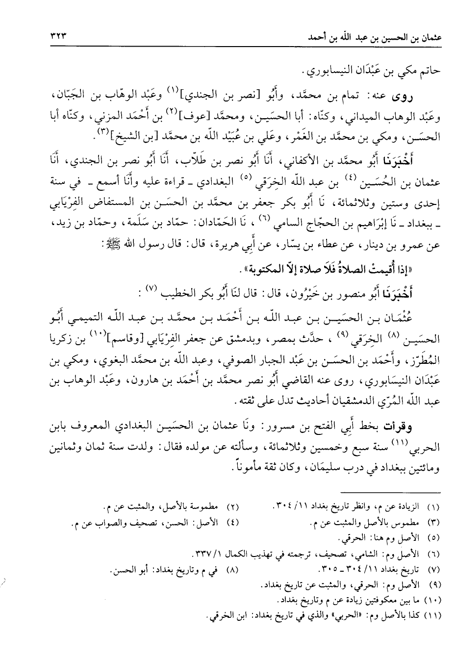 حاتم مكي بن عبدان النيسابوري " روى عنه تمام بن محمد وأبو نصر بن الجندي (1) وعبد الوهاب بن الجبان وعبد الوهاب الميداني وكناه أبا الحسين ومحمد عوف (2) بن أحمد المزني وكناه أبا الحسن ومكي بن محمد بن الغمر وعلي بن عبيد الله بن محمد بن الشيخ (3) أخبرنا أبو محمد بن الأكفاني أنا أبو نصر بن طلاب أنا أبو نصر بن الجندي أنا عثمان بن الحسين (4) بن عبد الله الخرقي (5) البغدادي قراءة عليه وأنا أسمع في سنة إحدى وستين وثلاثمائة نا أبو بكر جعفر بن محمد بن الحسن بن المستفاض الفريابي ببغداد نا إبراهيم بن الحجاج السامي نا الحمادان حماد بن سلمة وحماد بن زيد عن عمرو بن دينار عن عطاء بن يسار عن أبي هريرة قال قال رسول الله (صلى الله عليه وسلم) إذا أقيمت الصلاة فلا صلاة إلا المكتوبة أخبرنا أبو منصرو بن خيرون قال قال لنا أبو بكر الخطيب (7) عثمان بن الحسين بن عبد الله بن أحمد بن محمد بن عبد الله التميمي أبو الحسين (8) الخرقي (9) حدث بمصر ودمشق عن جعفر الفريابي وقاسم (10) بن زكريا المطرز وأحمد بن الحسن بن عبد الجبار الصوفي وعبد الله بن محمد البغوي ومكي بن عبدان النيسابوري روى عنه القاضي أبو نصر محمد بن أحمد بن هارون وعبد الوهاب بن عبد الله المري الدمشقيان أحاديث تدل على ثقته وقرأت بخط أبي الفتح بن مسرور ونا عثمان بن الحسين البغدادي المعروف بابن الحربي (11) سنة سبع وخمسين وثلاثمائة وسألته عن مولده فقال ولدت سنة ثمان وثمانين ومائتين ببغداد في درب سليمان وكان ثقة مأمونا
