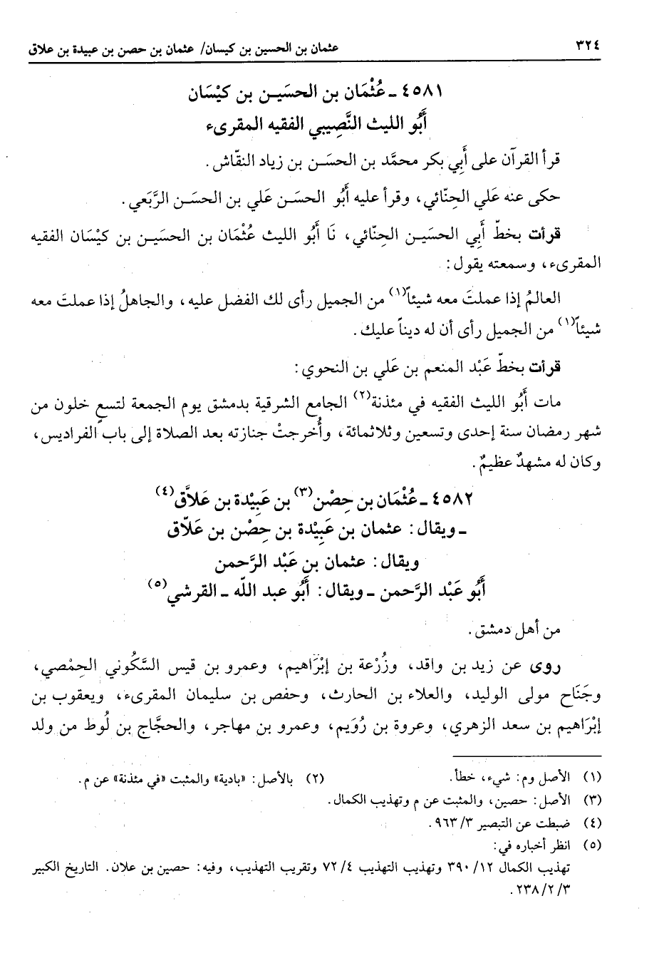 4581 - عثمان بن الحسين بن كيسان أبو الليث النصيبي الفقيه المقرئ قرأ القرآن على أبي بكر محمد بن الحسن بن زياد النقاش حكى عنه علي الحنائي وقرأ عليه أبو الحسن علي بن الحسن الربعي قرأت بخط أبي الحسين الحنائي نا أبو الليث عثمان بن الحسين بن كيسان الفقيه المقرئ وسمعته يقول العالم إذا عملت معه شيئا (1) من الجميل رأى لك الفضل عليه والجاهل إذا عملت معه شيئا (1) من الجميل رأى أن له دينا عليك قرأت بخط عبد المنعم بن علي بن النحوي مات أبو الليث الفقيه في مئذنة (2) الجامع الشرقية بدمشق يو م الجمعة لتسع خلون من شهر رمضان سنة إحدى وتسعين وثلاثمائة وأخرجت جنازته بعد الصلاة إلى باب الفراديس وكان له مشهد عظيم