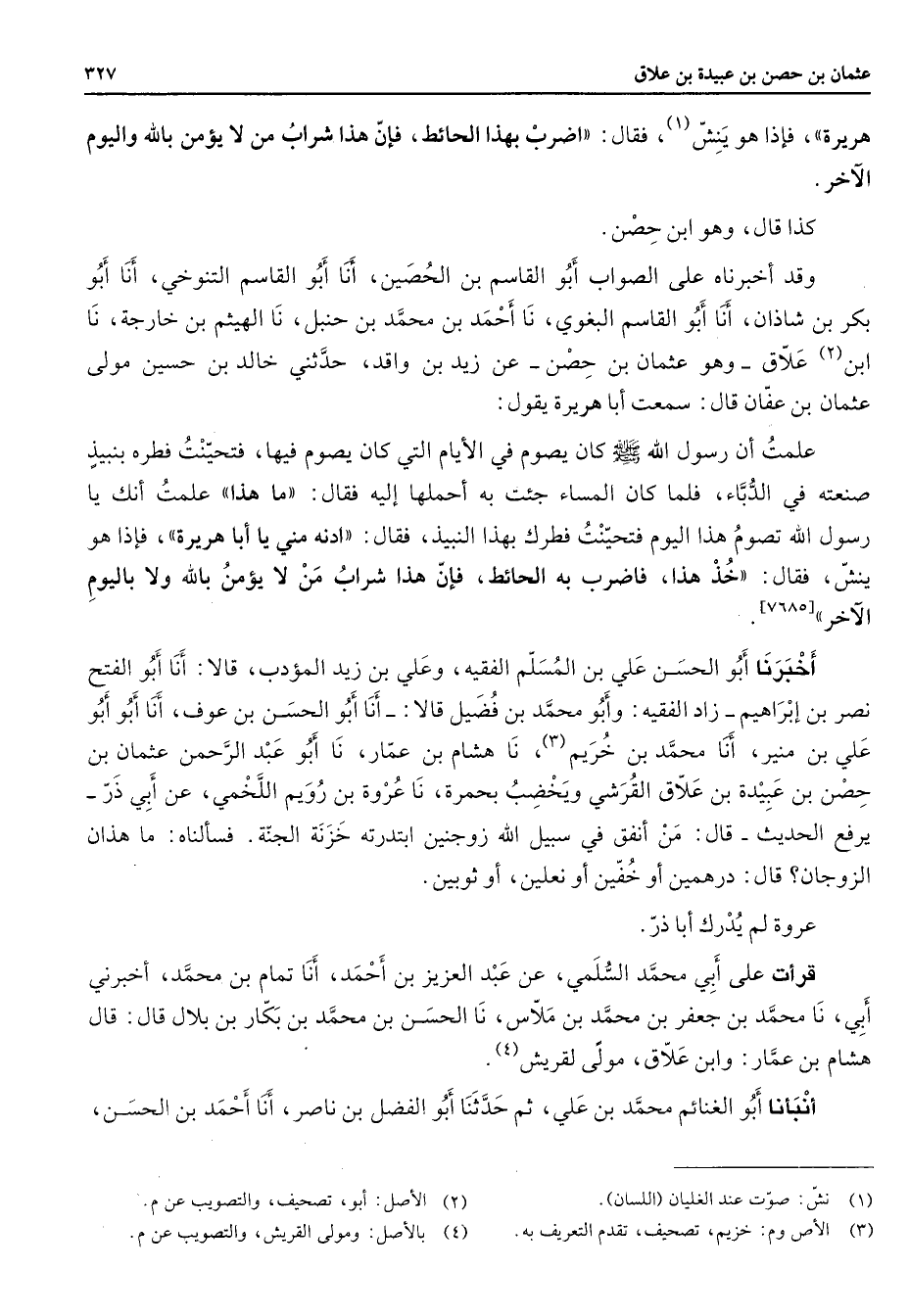 هريرة فإذا هو ينش (1) فقال اضرب بهذا الحائط فإن هذا شراب من لا يؤمن بالله واليوم الآخر كذا قال وهو ابن حصن وقد أخبرناه على الصواب أبو القاسم بن الحصين أنا أبو القاسم التنوخي أنا أبو بكر بن شاذان أنا أبو القاسم البغوي نا أحمد بن محمد بن حنبل نا الهيثم بن خارجة نا ابن (2) علاق وهو عثمان بن حصن عن زيد بن واقد حدثني خالد بن حسين مولى عثمان بن عفان قال سمعت أبا هريرة يقول علمت أن رسول الله (صلى الله عليه وسلم) كان يصوم في الأيام التي كان يصوم فيها فتحينت فطره بنبيذ صنعته في الدباء فلما كان المساء جئت به أحملها إليه فقال ما هذا علمت أنك يا رسول الله تصوم هذا اليوم فتحينت فطرك بهذا النبيذ فقال ادنه مني يا أبا هريرة فإذا هو ينش فقال خذ هذا فاضرب به الحائط فإن هذا شراب من لا يؤمن بالله ولا باليوم الآخر أخبرنا أبو الحسن علي بن مسلم الفقيه وعلي بن زيد المؤدب قالا أنا أبو الفتح نصر بن إبراهيم زاد الفقيه وأبو محمد بن فضيل قالا أنا أبو الحسن بن عوف أنا أبو أبو علي بن منير أنا محمد بن خريم (3) نا هشام بن عمار نا أبو عبد الرحمن عثمان بن حصن بن عبيدة بن علاق القرشي ويخضب بحمرة نا عروة بن رويم اللخمي عن أبي ذر يرفع الحديث قال من أنفق في سبيل الله زوجنين ابتدرته خزنة الجنة فسألناه ما هذان الزوجان قال درهمين أو خفين أو نعلين أو ثوبين عروة لم يدرك أبا ذر قرأت على أبي محمد السلمي عن عبد العزيز بن أحمد أنا تمام بن محمد أخبرني أبي نا محمد بن جعفر بن محمد بن ملاس نا الحسن بن محمد بن بكار بن بلال قال قال هشام بن عمار وابن علاق مولى لقريش (4) أنبأنا أبو الغنائم محمد بن علي ثم حدثنا أبو الفضل بن ناصر أنا أحمد بن الحسن