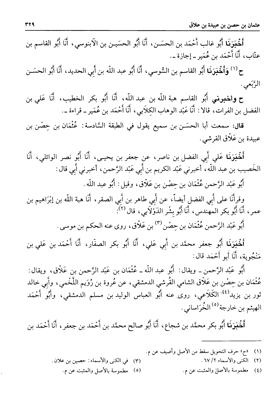 أخبرنا أبو غالب أحمد بن الحسن أنا أبو الحسين بن الآبنوسي أنا أبو القاسم بن عتاب أنا أحمد بن عمير إجازة ح (1) وأخبرنا أبو القاسم بن السوسي أنا أبو عبد الله بن أبي الحديد أنا أبو الحسن الربعي ح وأخبرني أبو القاسم هبة الله بن عبد الله أنا أبو بكر الخطيب أنا علي بن الفضل بن الفرات قالا أنا عبد الوهاب الكلابي أنا أحمد بن عمير قراءة قال سمعت أبا الحسن بن سميع يقول في الطبقة السادسة عثمان بن حصن بن عبيدة بن علاق القرشي أخبرنا علي أبي الفضل بن ناصر عن جعفر بن يحيى أنا أبو نصر الوائلي أنا الخصيب بن عبد الله أخبرني عبد الكريم بن أبي عبد الرحمن أخبرني أبي قال أبو عبد الرحمن عثمان بن حصن بن علاق وقيل أبو عبد الله وقرأنا على أبي الفضل أيضا عن أبي طاهر بن أبي الصقر أنا هبة الله بن إبراهيم بن عمر أنا أبو بكر المهندس أنا أبو بشر الدولابي قال (2) أبو عبد الرحمن عثمان بن حصن (3) بن علاق روى عنه الحكم بن موسى أخبرنا أبو جعفر محمد بن أبي علي أنا أبو بكر الصفار أنا أحمد بن علي بن منجوية أنا أبو أحمد قال أبو عبد الرحمن ويقال أبو عبد الله عثمان بن عبد الرحمن بن علاق ويقال عثمان بن حصن بن علاق الشامي القرشي الدمشقي عن عروة بن رويم اللخمي وأبي خالد ثور بن يزيد (4) الكلاعي روى عنه أبو العباس الوليد بن مسلم الدمشقي وأبو أحمد الهيثم بن خارجة (5) الخراساني أخبرنا أبو بكر محمد بن شجاع أنا أبو صالح محمد بن أحمد بن جعفر أنا أحمد بن