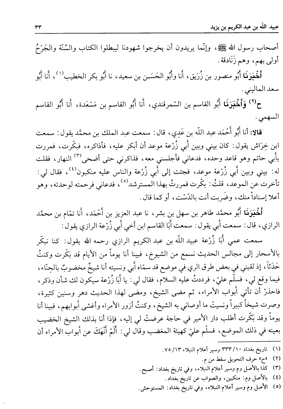 أصحاب رسول الله (صلى الله عليه وسلم) وإنما يريدون أن يخرجوا شهودنا ليبطلوا الكتاب والسنة والجرح أولى بهم وهم زنادقة أخبرنا أبو منصور بن زريق أنا وأبو الحسن بن سعيد نا أبو بكر الخطيب (1) أنا أبو سعد الماليني ح (2) وأخبرنا أبو القاسم بن السمرقندي أنا أبو القاسم بن مسعدة أنا أبو القاسم السهمي قالا أنا أبو أحمد عبد الله بن عدي قال سمعت عبد الملك بن محمد يقول سمعت ابن خراش يقول كان بيني وبين أبي زرعة موعد أن أبكر عليه فأذاكره فبكرت فممرت بأبي حاتم وهو قاعد وحده فدعاني فأجلسني معه فذاكرني حتى أضحى (3) النهار فقلت له بيني وبين أبي زرعة موعد فجئت إلى أبي زرعة والناس عليه منكبون (4) فقال لي تأخرت عن الموعد قلت بكرت فمررت بهذا المسترشد (5) فدعاني فرحمته لوحدته وهو أعلا إسنادا منك وضربت أنت بالدست أو كما قال أخبرنا أبو محمد طاهر بن سهل بن بشر نا عبد العزيز بن أحمد أنا تمام بن محمد الرازي قال سمعت أبي يقول سمعت أبا القاسم ابن أخي أبي زرعة الرازي يقول سمعت عمي أبا زرعة عبيد الله بن عبد الكريم الرازي رحمه الله يقول كنا نبكر بالأسحار إلى مجالس الحديث نسمع من الشيوخ فبينا أنا يوما من الأيام قد بكرت وكنت حدثا إذ لقيني في بعض طرق الري في موضع قد سماه أبي ونسيته أنا شيخ مخضوب بالحناء فيما وقع لي فسلم علي فرددت عليه السلام فقال لي يا أبا زرعة سيكون لك شأن وذكر فاحذر أن تأتي أبواب الأمراء ثم مضي الشيخ ومضى لهذا الحديث دهر وسنين كثيرة وصرت شيخا كبيرا ونسيت ما أوصاني به الشيخ وكنت أزور الأمراء وأغشى أبوابهم فبينا أنا يوما وقد بكرت أطلب دار الأمير في حاجة عرضت لي إليه فإذا أنا بذلك الشيخ الخضيب بعينه في ذلك الموضع فسلم علي كهيئة المغضب وقال لي ألم أنهك عن أبواب الأمراء أن