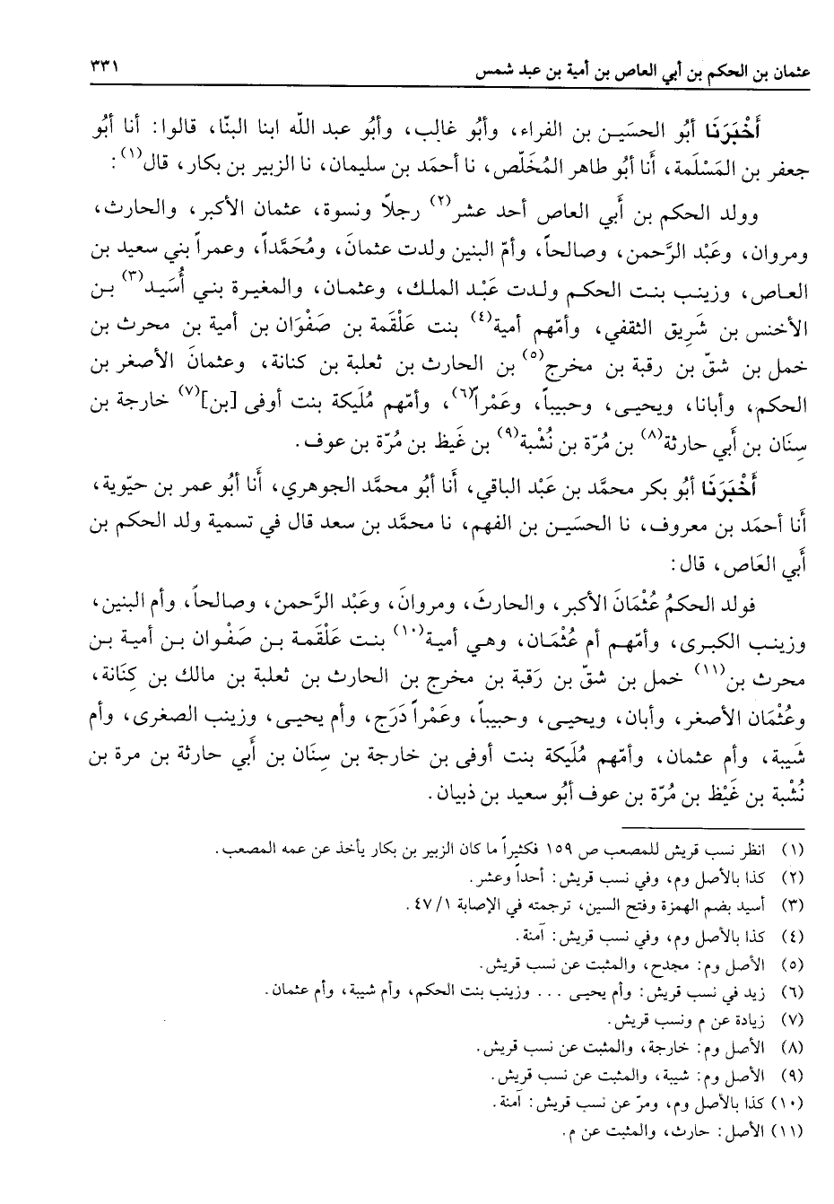 أخبرنا أبو الحسين بن الفراء وأبو غالب وأبو عبد الله ابنا البنا قالوا أنا أبو جعفر بن المسلمة أنا أبو طاهر المخلص نا أحمد بن سليمان نا الزبير بن بكار قال (1) وولد الحكم بن أبي العاص أحد عشر (2) رجلا ونسوة عثمان الأكبر والحارث ومروان وعبد الرحمن وصالحا وأم البنين ولدت عثمان ومحمدا وعمرا بني سعيد بن العاص وزينب بنت الحكم ولدت عبد الملك وعثمان والمغيرة بني أسيد (3) بن الأخنس بن شريق الثقفي وأمهم أمية (4) بنت علقمة بن صفوان بن أمية بن محرث بن خمل بن شق بن رقبة بن مخرج (5) بن الحارث بن ثعلبة بن كنانة وعثمان الأصغر بن الحكم وأبانا ويحيى وحبيبا وعمرا (6) وأمهم مليكة بنت أوفى بن (7) خارجة بن سنان بن أبي حارثة (8) بن مرة بن نشبة (9) بن غيظ بن مرة بن عوف أخبرنا أبو بكر محمد بن عبد الباقي أنا أبو محمد الجوهري أنا أبو عمر بن حيوية أنا أحمد بن معروف نا الحسين بن الفهم نا محمد بن سعد قال في تسمية ولد الحكم بن أبي العاص قال فولد الحكم عثمان الأكبر والحارث ومروان وعبد الرحمن وصالحا وأم البنين وزينب الكبرى وأمهم أم عثمان وهي أمية (10) بنت علقمة بن صفوان بن أمية بن محرث بن (11) خمل بن شق بن رقبة بن مخرج بن الحارث بن ثعلبة بن مالك بن كنانة وعثمان الأصغر وأبان ويحيى وحبيبا وعمرا درج وأم يحيى وزينب الصغرى وأم شيبة وأم عثمان وأمهم مليكة بنت أوفى بن خارجة بن سنان بن أبي حارثة بن مرة بن نشبة بن غيظ بن مرة بن عوف أبو سعيد بن ذبيان