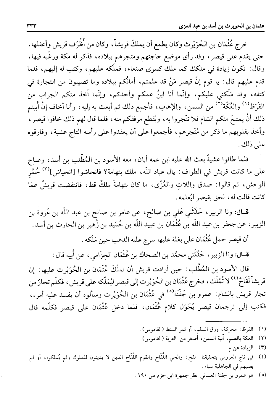 خرج عثمان بن الحويرث وكان يطمع أن يملك قريشا وكان من أظرف قريش وأعقلها حتى قدم على قيصر وقد رأى موضع حاجتهم ومتجرهم ببلاده فذكر له مكة ورغبه فيها وقال تكون زيادة في ملكك كما ملك كسرى صنعاء فملكه عليهم وكتب له إليهم فلما قدم عليهم قال يا قوم إن قيصر من قد علمتم أمانكم ببلاده وما تصيبون من التجارة في كنفه وقد ملكني عليكم وإنما أنا ابن عمكم وأحدكم وإنما آخذ منكم الجراب من القرظ (1) والعكة (2) من السمن والإهاب فأجمع ذلك ثم أبعث به إليه وأنا أخاف إن أبيتم ذلك أن يمتنع منكم الشام فلا تتجروا به ويقطع مرفقكم منه فلما قال لهم ذلك خافوا قيصر وأخذ بقلوبهم ما ذكر من متجرهم فأجمعوا على أن يعقدوا على رأسه التاج عشية وفارقوه على ذلك فلما طافوا عشية بعث الله عليه ابن عمه أبان معه الأسود بن المطلب بن أسد وصاح على ما كانت قريش في الطواف يال عباد الله ملك بتهامة فانحاشوا انحياش (3) حمر الوحش ثم قالوا صدق واللات والعزى ما كان بتهامة ملك قط فانتفضت قريش عما كانت قال له لحق بقيصر ليعلمه قال ونا الزبير حدثني علي بن صالح عن عامر بن صالح بن عبد الله بن عروة بن الزبير عن جعفر بن عبد الله بن عثمان بن عبيد الله بن حميد بن زهير بن الحارث بن أسد أن قيصر حمل عثمان على بغلة عليها سرج عليه الذهب حين ملكه قال ونا الزبير حدثني محمد بن الضحاك بن عثمان الحزامي عن أبيه قال قال الأسود بن المطلب حين أرادت قريش أن تملك عثمان بن الحويرث عليها أن قريشا لقاح (4) لا تملك فخرج عثمان بن الحويرث إلى قيصر ليملكه على قريش فكلم تجار من تجار قريش بالشام عمرو بن جفنة (5) في عثمان بن الحويرث وسألوه أن يفسد عليه أمره فكتب إلى ترجمان قيصر يحول كلام عثمان فلما دخل عثمان على قيصر فكلمه قال