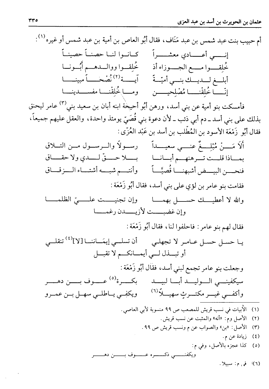 أم حبيب بنت عبد شمس بن عبد مناف فقال أبو العاص بن أمية بن عبد شمس أو غيره (1) * إني أعادي معشرا * كانوا لنا حصنا حصينا خلقوا مع الجوزاء أذ * خلقوا ووالدهم أبونا أبلغ لديك بني أمية * آية (2) نصحا مبينا إنا خلقنا مصلحين * وما خلقنا مفسدينا * فأمسكت بنوا أمية عن بني أسد ورهن أبو أحيحة ابنه أبان بن سعيد بني (3) عامر ليحنق بذلك على بني أسد دم أبي ذئب لأن دعوة بني قصي يومئذ واحدة والعقل عليهم جميعا فقال أبو زمعة الأسود بن المطلب بن أسد بن عبد العزى * ألا من مبلغ عني سعيدا * رسولا والرسول من التلاق بماذا قلت ترهنهم أبانا * بلا حق لدي ولا حقاق فنحن البيض أشبهنا قصيا * وأنتم شبه أشتاء الزقاق * فقامت بنو عامر بن لؤي على بني أسد فقال أبو زمعة * والله لا أعطيك حسل بهما * وإن تجنيت علي الظلما وإن غضبت لأزيدن رغما فقال لهم بنو عامر فاحلفوا لنا فقال أبو زمعة * يا حسل حسل عامر لا تجهلي * أن تسلي إيماننا لا (4) تنقلي أو تبذل لي أيمانكم لا تقبل وجعلت بنو عامر تجمع لبني أسد فقال أبو زمعة * سيكفيني الوليد أبا لبيد * بكرة (5) عوف بن دهر وأكفي غير مكترث سهيلا (6) * ويكفي ياطلي سهل بن عمرو