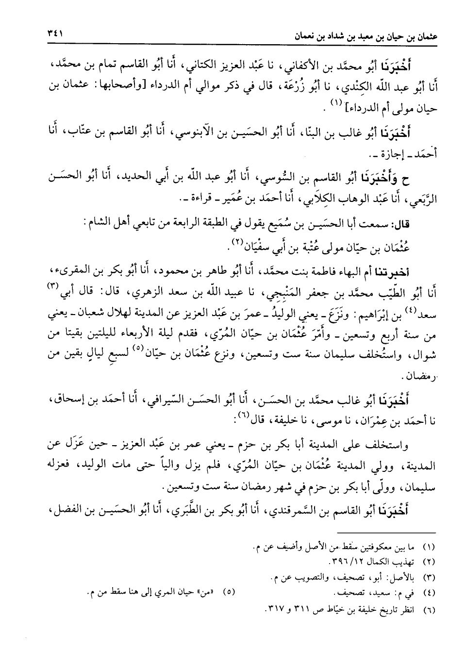 أخبرنا أبو محمد بن الأكفاني نا عبد العزيز الكتاني أنا أبو القاسم تمام بن محمد أنا أبو عبد الله الكندي أنا أبو زرعة قال في ذكر موالي أم الدرداء وأصحابها عثمان بن حيان مولى أم الدرداء (1) أخبرنا أبو غالب بن البنا أنا أبو الحسين بن الآبنوسي أنا أبو القاسم بن عتاب أنا أحمد إجازة ح وأخبرنا أبو القاسم بن السوسي أنا أبو عبد الله بن أبي الحديد أنا أبو الحسن الربعي أنا عبد الوهاب الكلابي أنا أحمد بن عمير قراءة قال سمعت أبا الحسين بن سميع يقول في الطبقة الرابعة من تابعي أهل الشام عثمان بن حيان مولى عتبة بن أبي سفيان (2) أخبرتنا أم البهاء فاطمة بنت محمد أنا أبو طاهر بن محمود أنا أبو بكر بن المقرئ أنا أبو الطيب محمد بن جعفر المنبجي نا عبيد الله بن سعد الزهري قال قال أبي (3) سعد (4) بن إبراهيم ونزع يعني الوليد عمر بن عبد العزيز عن المدينة لهلال شعبان يعني من سنة أربع وتسعين وأمر عثمان بن حيان المري فقدم ليلة الأربعاء لليلتين بقيتا من شوال واستخلف سليمان سنة ست وتسعين ونزع عثمان بن حيان لسبع ليال بقين من رمضان أخبرنا أبو غالب محمد بن الحسن أنا أبو الحسن السيرافي أنا أحمد بن إسحاق نا أحمد بن عمران نا موسى نا خليفة قال (6) واستخلف على المدينة أبا بكر بن حزم يعني عمر بن عبد العزيز حين عزل عن المدينة وولي المدينة عثمان بن حيان المري فلم يزل واليا حتى مات الوليد فعزله سليمان وولى أبا بكر بن حزم في شهر رمضان سنة ست وتسعين أخبرنا أبو القاسم بن السمرقندي أنا أبو بكر بن الطبري أنا أبو الحسين بن الفضل