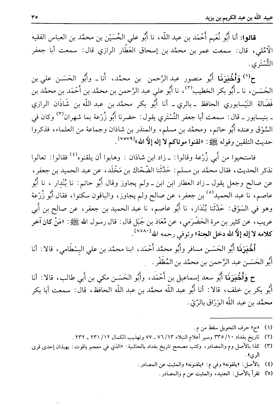قالوا أنا أبو نعيم أحمد بن عبد الله نا أبو علي الحسين بن محمد بن العباس الفقيه الآملي قال سمعت عمر بن محمد بن إسحاق العطار الرازي قال سمعت أبا جعفر التستري ح (1) وأخبرنا أبو منصور عبد الرحمن بن محمد أنا وأبو الحسن علي بن الحسن نا أبو بكر الخطيب (2) نا أبو علي عبد الرحمن بن محمد بن أحمد بن محمد بن فضالة النيسابوري الحافظ بالري أنا أبو بكر محمد بن عبد الله بن شاذان الرازي بنيسابور قال سمعت أبا جعفر التستري يقول حضرنا أبو زرعة بما شهران (3) وكان في السوق وعنده أبو حاتم ومحمد بن مسلم والمنذر بن شاذان وجماعة من العلماء فذكروا حديث التلقين وقوله (صلى الله عليه وسلم) لقنوا موتاكم لا إله إلا الله