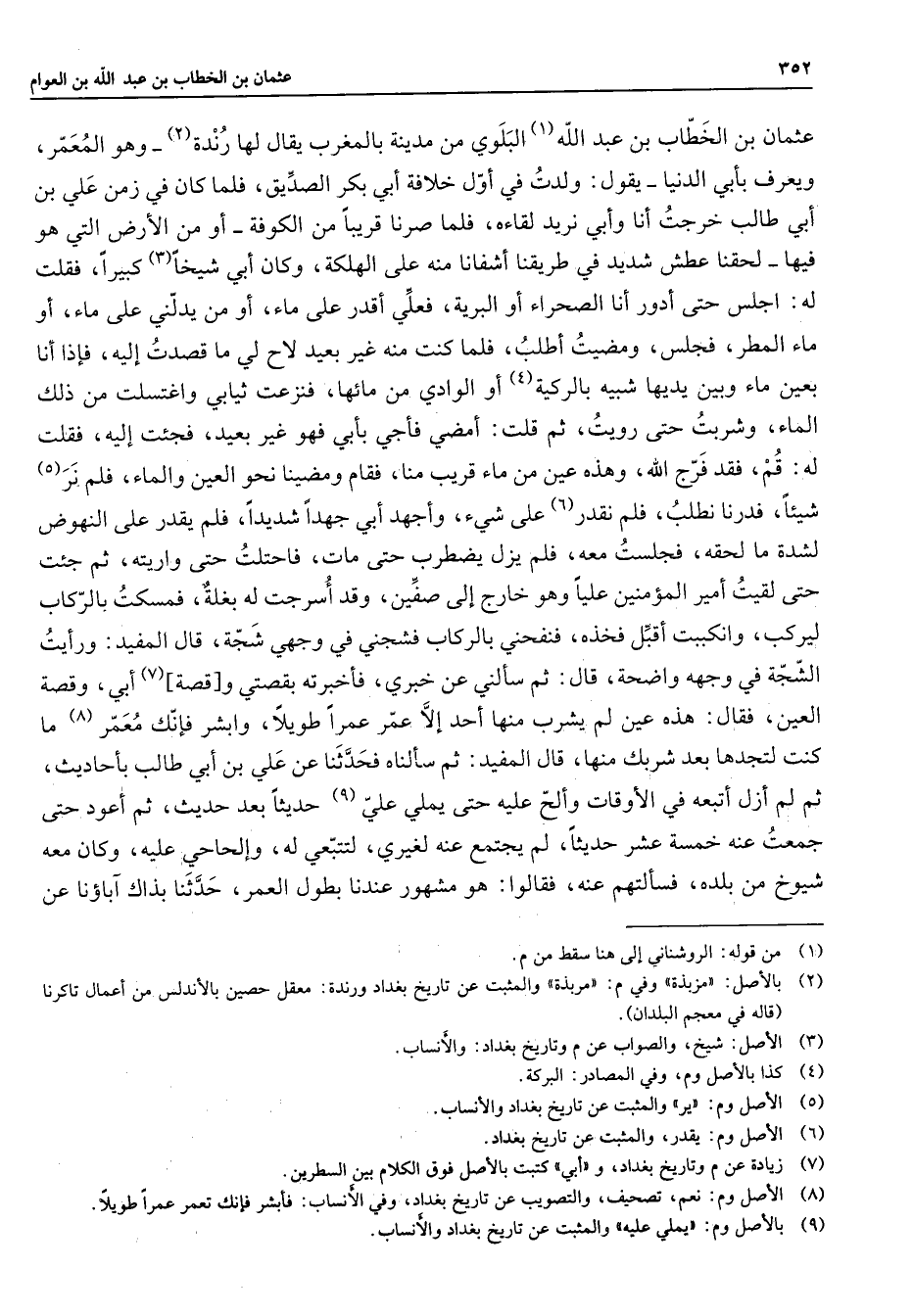 عثمان بن الخطاب بن عبد الله (1) البلوي من مدينة بالمغرب يقال لها رندة (2) وهو المعمر ويعرف بأبي الدنيا يقول ولدت في أول خلافة أبي بكر الصديق فلما كان في زمن علي بن أبي طالب خرجت أنا وأبي نريد لقاءه فلما صرنا قريبا من الكوفة أو من الأرض التي هو فيها لحقنا عطش شديد في طريقنا أشفانا منه على الهلكة وكان أبي شيخنا (3) كبيرا فقلت له اجلس حتى أدور أنا الصحراء أو البرية فعلي أقدر على ماء أو من يدلني على ماء أو ماء المطر فجلس ومضيت أطلب فلما كنت منه غير بعيد لاح لي ما قصدت إليه فإذا أنا بعين ماء وبين يديها شبيه بالركية (4) أو الوادي من مائها فنزعت ثيابي واغتسلت من ذلك الماء وشربت حتى رويت ثم قلت أمضي فأجي بأبي فهو غير بعيد فجئت إليه فقلت له قم فقد فرج الله وهذه عين من ماء قريب منا فقام ومضينا نحو العين والماء فلم نر (5) شيئا فدرنا نطلب فلم نقدر (6) على شئ وأجهد أبي جهدا شديدا فلم يقدر على النهوض لشدة ما لحقه فجلست معه فلم يزل يضطرب حتى مات فاحتلت حتى واريته ثم جئت حتى لقيت أمير المؤمنين عليا وهو خارج إلى صفين وقد أسرجت له بغلة فمسكت بالركاب ليركب وانكببت أقبل فخذه فنفحني بالركاب فشجني في وجهي شجة قال المفيد ورأيت الشجة في وجهه واضحة قال ثم سألني عن خبري فأخبرته بقصتي وقصة (7) أبي وقصة العين فقال هذه عين لم يشرب منها أحد إلا عمر عمرا طويلا وابشر فإنك معمر (8) ما كنت لتجدها بعد شربك منها قال المفيد ثم سألناه فحدثنا عن علي بن أبي طالب بأحاديث ثم لم أزل أتبعه في الأوقات وألح عليه حتى يملي علي (9) حديثا بعد حديث ثم أعود حتى جمعت عنه خمسة عشرة حديثا لم يجتمع عنه لغيري لتتبعي له وإلحاحي عليه وكان معه شيوخ من بلده فسألتهم عنه فقالوا هو مشهور عندنا بطول العمر حدثنا بذاك آباؤنا عن