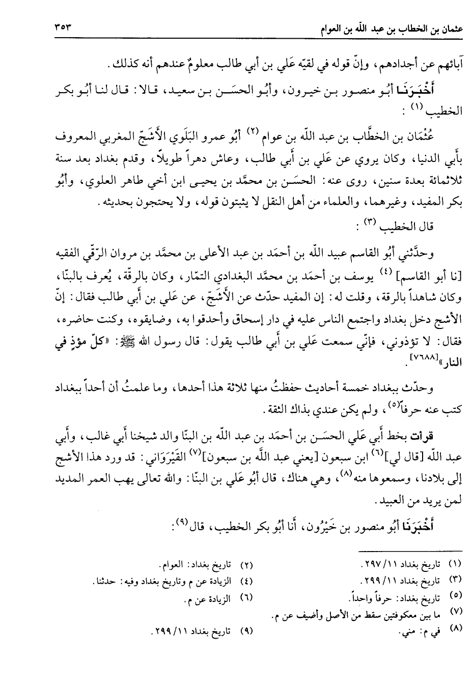 آبائهم عن أجدادهم وإن قوله في لقيه علي بن أبي طالب معلوم عندهم أنه كذلك أخبرنا أبو منصور بن خيرون وأ بو الحسن بن سعيد قالا قال لنا أبو بكر الخطيب (1) عثمان بن الخطاب بن عبد الله بن عوام (2) أبو عمرو البلوي الأشج المغربي المعروف بأبي الدنيا وكان يروي عن علي بن أبي طالب وعاش دهرا طويلا وقدم بغداد بعد سنة ثلاثمائة بعدة سنين روى عنه الحسن بن محمد بن يحيى ابن أخي طاهر العلوي وأبو بكر المفيد وغيرهما والعلماء من أهل النقل لا يثبتون قوله ولا يحتجون بحديثه قال الخطيب (3) وحدثني أبو القاسم عبيد الله بن أحمد بن عبد الأعلى بن محمد بن مروان الرقي الفقيه نا أبو القاسم (4) يوسف بن أحمد بن محمد البغدادي التمار وكان بالرقة يعرف بالبنا وكان شاهدا بالرقة وقلت له إن المفيد حدث عن الأشج عن علي بن أبي طالب فقال إن الأشج دخل بغداد واجتمع الناس عليه في دار إسحاق واحدقوا به وضايقوه وكنت حاضره فقال لا تؤذوني فإني سمعت علي بن أبي طالب يقول قال رسول الله (صلى الله عليه وسلم) كل مؤذ في النار وحدث ببغداد خمسة أحاديث حفظت منها ثلاثة هذا أحدها وما علمت أن أحدا ببغداد كتب عنه حرفا (5) ولم يكن عندي بذاك الثقة قرأت بخط أبي علي الحسن بن أحمد بن عبد الله بن البنا والد شيخنا أبي غالب وأبي عبد الله قال لي (6) ابن سبعون يعني عبد الله بن سبعون (7) القيرواني قد ورد هذا الأشج إلى بلادنا وسمعوها منه (8) وهي هناك قال أبو علي بن البنا والله تعالى يهب العمر المديد لمن يريد من العبيد أخبرنا أبو منصور بن خيرون أنا أبو بكر الخطيب قال (9)