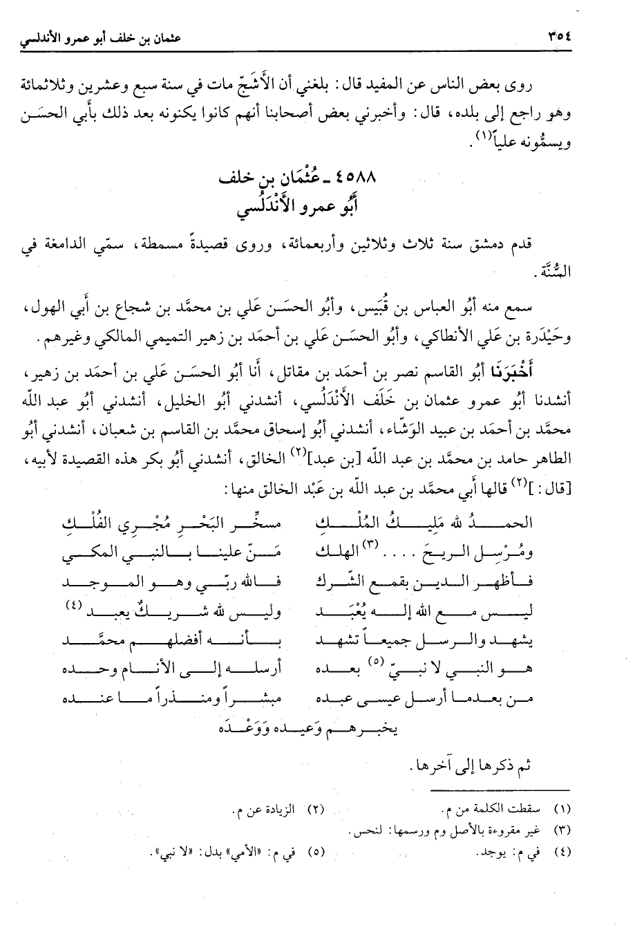 4588 - عثمان بن خلف أبو عمرو الأندلسي قدم دمشق سنة ثلاث وثلاثين وأربعمائة وروى قصيدة مسمطة سمي الدامغة في السنة سمع منه أبو العباس بن قبيس وأبو الحسن علي بن محمد بن شجاع بن أبي الهول وحيدرة بن علي الأنطاكي وأبو الحسن علي بن أحمد بن زهير التميمي المالكي وغيرهم أخبرنا أبو القاسم نصر بن أحمد بن مقاتل أنا أبو الحسن علي بن أحمد بن زهير أنشدنا أبو عمرو عثمان بن خلف الأندلسي أنشدني أبو الخليل أنشدني أبو عبد الله محمد بن أحمد بن عبيد الوشاء أنشدني أبو إسحاق محمد بن القاسم بن شعبان أنشدني أبو الطاهر حامد بن محمد بن عبد الله بن عبد (2) الخالق أنشدني أبو بكر هذه القصيدة لأبيه قال (2) قالها أبي محمد بن عبد الله بن عبد الخالق منها * الحمد لله مليك الملك * مسخر البحر مجري الفلك ومرسل الريح (3) الهلك * من علينا بالنبي المكي فأظهر الدين بقمع الشرك * فالله ربي وهو الموجد ليس مع الله إله يعبد * وليس لله شريك يعبد (4) يشهد والرسل جميعا تشهد * بأنه أفضلهم محمد هو النبي لا نبي (5) بعده * أرسله إلى الأنام وحده من بعدما أرسل عيسى عبده * مبشرا ومنذرا ما عنده يخبرهم وعيده ووعده ثم ذكرها إلى آخرها