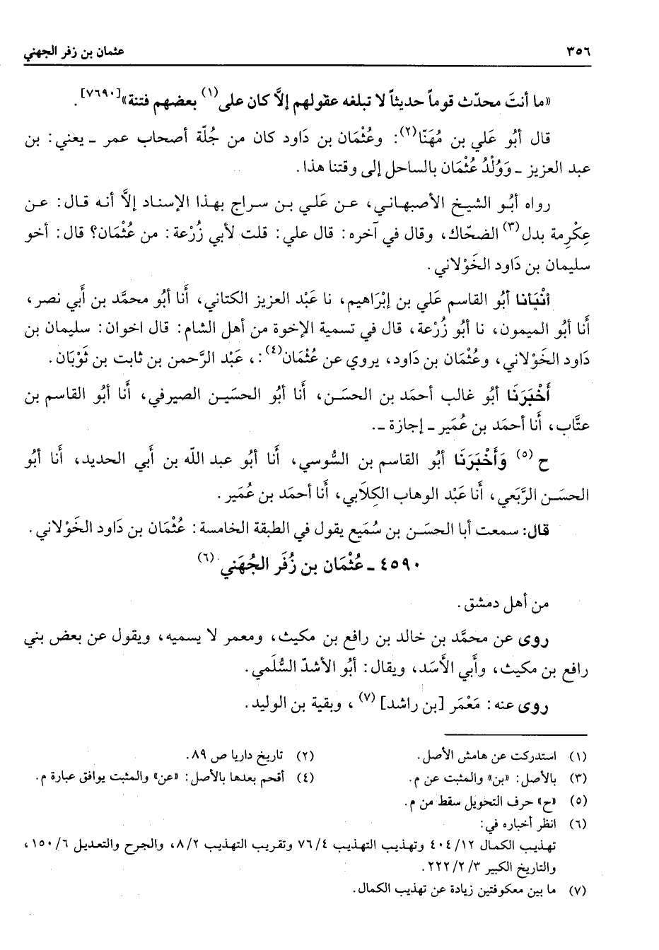 4590 - عثمان بن زفر الجهني (6) من أهل دمشق روى عن محمد بن خالد بن رافع بن مكيث ومعمر لا يسميه ويقول عن بعض بني رافع بن مكيث وأبي الأسد ويقال أبو الأشد السلمي روى عنه معرم بن راشد (7) وبقيه بن الوليد