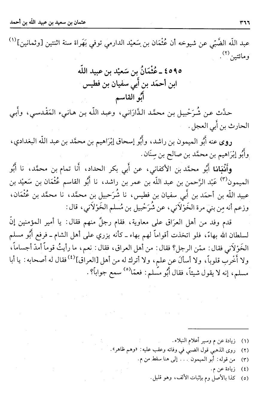4595 - عثمان بن سعيد بن عبيد الله ابن أحمد بن أبي سفيان بن فطيس أبو القاسم حدث عن شرحبيل بن محمد الداراني وعبد الله بن هانئ المقدسي وأبي الحارث بن أبي العجل روى عنه أبو الميمون بن راشد وأبو إسحاق إبراهيم بن محمد بن عبد الله البغدادي وأبو إبراهيم بن محمد بن صالح بن سنان وأنبأنا أبو محمد بن الأكفاني عن أبي بكر الحداد أنا تمام بن محمد نا أبو الميمون (3) عبد الرحمن بن عبد الله بن عمر بن راشد نا أبو القاسم عثمان بن سعيد بن عبيد الله بن أحمد بن أبي سفيان بن فطيس نا شرحبيل بن محمد نا محمد بن عثمان وزعم أنه من بني مرة الخولاني عن شرحبيل بن مسلم الخولاني قال قدم وفد من أهل العراق على معاوية فقام رجل منهم فقال يا أمير المؤمنين إن لسلطان الله بهاء فلو اتخذت أقواما لهم بهاء كأنه يزري على أهل الشام فرفع أبو مسلم الخولاني فقال ممن الرجل فقال من أهل العراق فقال نعم ما رأيت قوما أمد أجساما ولا أخرب قلوبا ولا أسأل عن علم ولا أترك له من أهل العراق (4) فقال له أصحابه يا أبا مسلم إنه لا يقول شيئا فقال أبو مسلم فعما (5) سمع جوابا