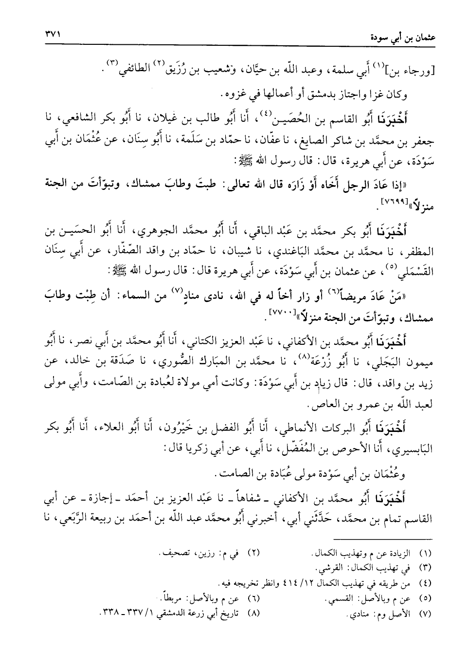 ورجاء بن (1) أبي سلمة وعبد الله بن حيان وشعيب بن رزيق (2) الطائفي (3) وكان غزا واجتاز بدمشق أو أعمالها في غزوه أخبرنا أبو القاسم بن الحصين (4) أنا أبو طالب بن غيلان نا أبو بكر الشافعي نا جعفر بن محمد بن شاكر الصايغ نا عفان نا حماد بن سلمة نا أبو سنان عن عثمان بن أبي سودة عن أبي هريرة قال قال رسول الله (صلى الله عليه وسلم) إذا عاد الرجل أخاه أو زاره قال الله تعالى طبت وطاب ممشاك وتبوأت من الجنة منزلا أخبرنا أبو بكر محمد بن عبد الباقي أنا أبو محمد الجوهري أنا أبو الحسين بن المظفر نا محمد بن محمد الباغندي نا شيبان نا حماد بن واقد الصفار عن أبي سنان القسملي (5) عن عثمان بن أبي سودة عن أبي هريرة قال قال رسول الله (صلى الله عليه وسلم) من عاد مريضا (6) أو زار أخا له في الله نادى مناد من السماء أن طبت وطاب ممشاك وتبوأت من الجنة منزلا أخبرنا أبو محمد بن الأكفاني نا عبد العزيز الكتاني أنا أبو محمد بن أبي نصر نا أبو ميمون البجلي نا أبو زرعة (8) نا محمد بن المبارك الصوري نا صدقة بن خالد عن زيد بن واقد قال قال زياد بن أبي سودة وكانت أمي مولاة لعبادة بن الصامت وأبي مولى لعبد الله بن عمرو بن العاص أخبرنا أبو البركات الأنماطي أنا أبو الفضل بن خيرون أنا أبو العلاء أنا أبو بكر
