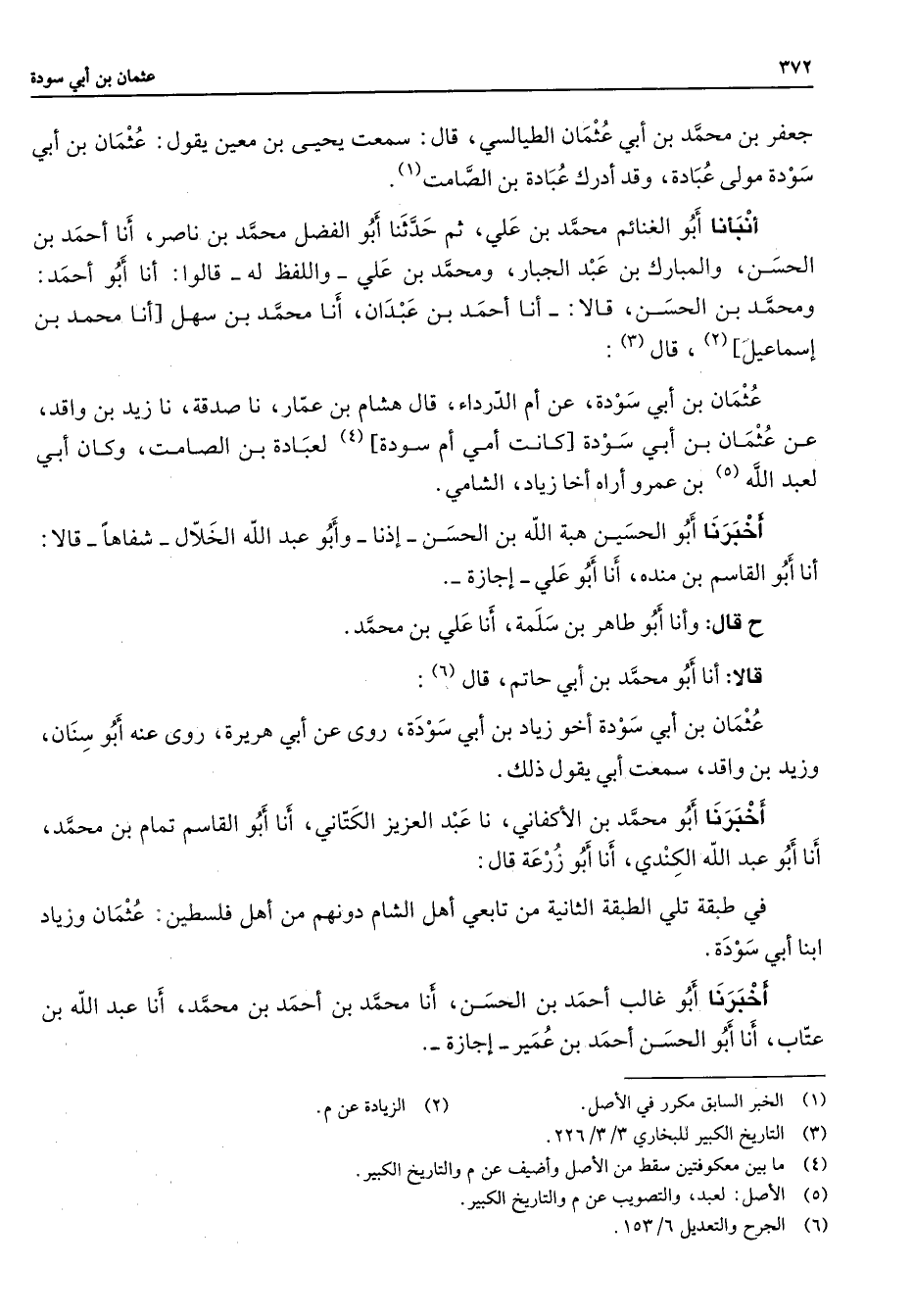 جعفر بن محمد بن أبي عثمان الطيالسي قال سمعت يحيى بن معين يقول عثمان بن أبي سودة مولى عبادة وقد أدرك عبادة بن الصامت (1) أنبأنا أبو الغنائم محمد بن علي ثم حدثنا أبو الفضل محمد بن ناصر أنا أحمد بن الحسن والمبارك بن عبد الجبار ومحمد بن علي واللفظ له قالوا أنا أبو أحمد ومحمد بن الحسن قالا أنا أحمد بن عبدان أنا محمد بن سهل أنا محمد بن إسماعيل (2) قال (3)