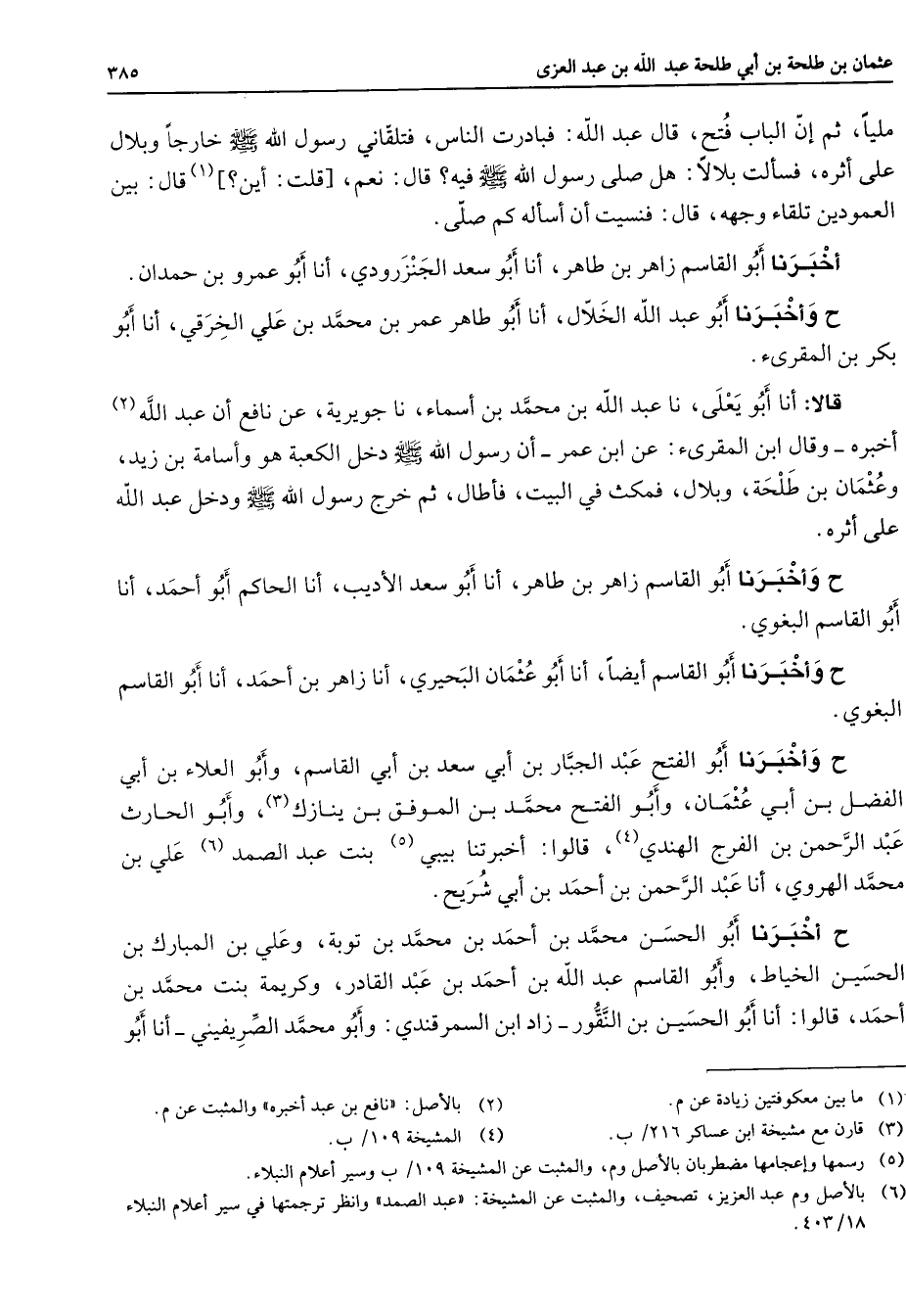 (5) رسمها وإعجامها مضطربان بالاصل وم والمثبت عن المشيخة 109 / ب وسير أعلام النبلاء