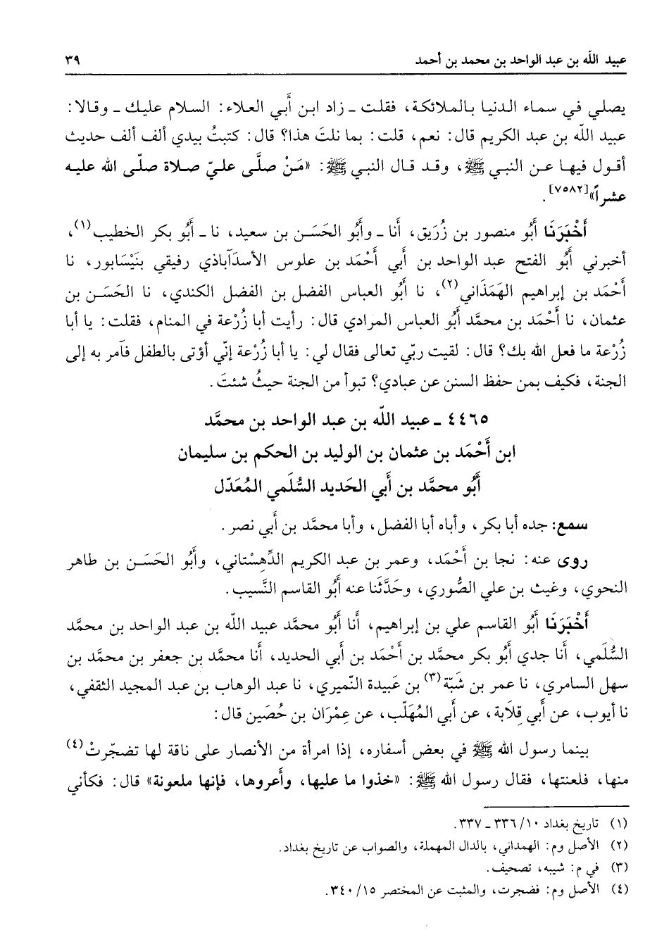 [7582] أخبرنا أبو منصور بن زريق أنا وأبو الحسن بن سعيد نا أبو بكر الخطيب (1) أخبرني أبو الفتح عبد الواحد بن أبي أحمد بن علوس الأسدا باذي رفيقي بنيسابور نا أحمد بن إبراهيم الهمذاني (2) نا أبو العباس الفضل بن الفضل الكندي نا الحسن بن عثمان نا أحمد بن محمد أبو العباس المرادي قال رأيت أبو زرعة في المنام فقلت يا أبا زرعة ما فعل الله بك قال لقيت ربي تعالى فقال لي يا أبا زرعة إني أؤتي بالطفل فأمر به إلى الجنة فكيف بمن حفظ السنن عن عبادي تبوأ من الجنة حيث شئت 4465 - عبيد الله بن عبد الواحد بن محمد بن أحمد بن عثمان بن الوليد بن الحكم بن سليمان أبو محمد بن أبي الحديد السلمي المعدل سمع جده أبا بكر وأباه أبا الفضل وأبا محمد بن أبي نصر روى عنه نجا بن أحمد وعمر بن عبد الكريم الدهستاني وأبو الحسن بن طاهر النحوي وغيث بن علي الصوري وحدثنا عنه أبو القاسم النسيب أخبرنا أبو القاسم علي بن إبراهيم أنا أبو محمد عبيد الله بن عبد الواحد بن محمد السلمي أنا جدي أبو بكر محمد بن أحمد بن أبي حديد أنا محمد بن جعفر بن محمد بن سهل السامري نا عمر بن شبة (3) بن عبيدة النميري نا عبد الوهاب بن عبد المجيد الثقفي نا أيوب عن أبي قلابة عن أبي المهلب عن عمران بن حصين قال بينما رسول الله (صلى الله عليه وسلم) في بعض أسفاره إذا إمرأة من الأنصار على ناقة لها تضجرت (4) منها فلعنتها فقال رسول الله (صلى الله عليه وسلم) خذوا ما عليها وأعروها فإنها ملعونة) قال فكأني