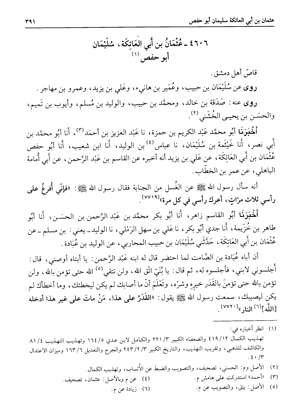 4606 - عثمان بن أبي العاتكة سليمان أبو حفص (1) قاص أهل دمشق روى عن سليمان بن حبيب وعمير بن هانئ وعلي بن يزيد وعمرو بن مهاجر روى عنه صدقة بن خالد ومحمد بن حبيب والوليد بن مسلم وأيوب بن تميم والحسن بن يحيى الخشني (2) أخبرنا أبو محمد عبد الكريم بن حمزة نا عبد العزيز بن أحمد (3) أنا أبو محمد بن أبي نصر أنا خيثمة بن سليمان نا عباس بن الوليد أنا ابن شعيب أنا أبو حفص عثمان بن أبي العاتكة عن علي بن يزيد أنه أخبره عن القاسم بن عبد الرحمن عن أبي أمامة الباهلي عن عمر بن الخطاب أنه سأل رسول الله (صلى الله عليه وسلم) عن الغسل من الجنابة فقال رسول الله (صلى الله عليه وسلم) فإني أفرغ على رأسي ثلاث مرات أعرك رأسي في كل مرة أخبرنا أبو القاسم زاهر أنا أبو بكر محمد بن عبد الرحمن بن الحسن أنا أبو طاهر بن خزيمة أنا جدي أبو بكر نا علي بن سهل الرملي نا الوليد يعني بن مسلم عن عثمان بن أبي العاتكة حدثني سليمان بن حبيب المحاربي عن الوليد بن عبادة أن أباه عبادة بن الصامت لما احتضر قال له ابنه عبد الرحمن يا أبتاه أوصني قال أجلسوني لأبني فأجلسوه له ثم قال يا بني اتق الله ولن تتقي (5) الله حتى تؤمن بالله ولن تؤمن بالله حتى تؤمن بالقدر خيره وشره وتعلم أن ما أصابك لم يكن ليخطئك وما أخطأك لم يكن ليصيبك سمعت رسول الله (صلى الله عليه وسلم) يقول القدر على هذا من مات على غير هذا أدخله الله (6) النار