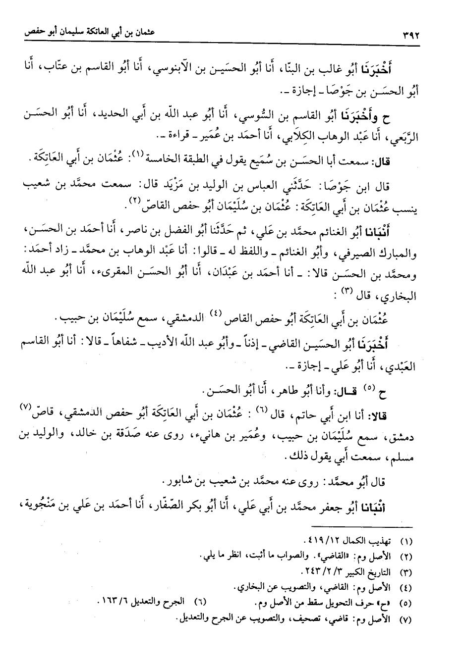 عن م وبالاصل: عثمان أخبرنا أبو غالب بن البنا أنا أبو الحسين بن الآبنوسي أنا أبو القاسم بن عتاب أنا أبو الحسن بن جوصا إجازة ح وأخبرنا أبو القاسم بن السوسي أنا أبو عبد الله بن أبي الحديد أنا أبو الحسن الربعي أنا عبد الوهاب الكلابي أنا أحمد بن عمير قراءة قال سمعت أبا الحسن بن سميع يقول في الطبقة الخامسة (1) عثمان بن أبي العاتكة قال ابن جوصا حدثني العباس بن الوليد بن مزيد قال سمعت محمد بن شعيب ينسب عثمان بن أبي العاتكة عثمان بن سليمان أبو حفص القاص (2) أنبأنا أبو الغنائم محمد بن علي ثم حدثنا أبو الفضل بن ناصر أنا أحمد بن الحسن والمبارك الصيرفي وأبو الغنائم واللفظ له قالوا أنا عبد الوهاب بن محمد زاد أحمد ومحمد بن الحسن قالا أنا أحمد بن عبدان أنا أبو الحسن المقرئ أنا أبو عبد الله البخاري قال (5) غثمان بن أبي العاتكة أبو حفص القاص (4) الدمشقي سمع سليمان بن حبيب أخبرنا أبو الحسين القاضي إذنا وأبو عبد الله الأديب شفاها قالا أنا أبو القاسم العبدي أنا أبو علي إجازة ح (5) قال وأنا أبو طاهر أنا أبو الحسن قالا أنا ابن أبي حاتم قال (6) عثمان بن أبي العاتكة أبو حفص الدمشقي قاص (7) دمشق سمع سليمان بن حبيب وعمير بن هانئ روى عنه صدقة بن خالد والوليد بن مسلم سمعت أبي يقول ذلك قال أبو محمد روى عنه محمد بن شعيب بن شابور أنبأنا أبو جعفر محمد بن أبي علي أنا أبو بكر الصفار أنا أحمد بن علي بن منجوية