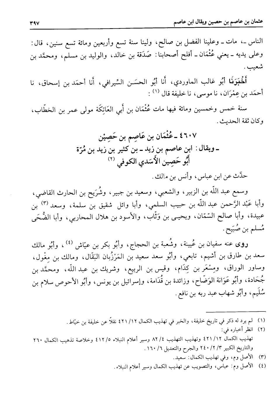 4607 - عثمان بن عاصم بن حصين ويقال ابن عاصم بن زيد بن كثير بن زيد بن مرة أبو حصين الأسدي الكوفي (2) حدث عن ابن عباس وأنس بن مالك وسمع عبد الله بن الزبير والشعبي وسعيد بن جبير وشريح بن الحارث القاضي وأبا عبد الرحمن عبد الله بن حبيب السلمي وأبا وائل شقيق بن سلمة وسعد (3) بن عبيدة وأبا صالح السمان ويحيى بن وثاب والأسود بن هلال المحاربي وأبا الضحى مسلم بن صبيح روى عنه سفيان بن عيينة وشعبة بن الحجاج وأبو بكر بن عياش (4) وأبو مالك سعد بن طارق بن أشيم تابعي وأبو سعد سعيد بن المرزبان البقال ومالك بن مغول وساور الوراق ومسعر بن كدام وقيس بن الربيع وشريك بن عبد الله ومحمد بن جحادة وأبو عوانة الوضاح وزائدة بن قدامة وإسرائيل بن يونس وأبو الأحوص سلام بن سليم وأبو شهاب عبد ربه بن نافع
