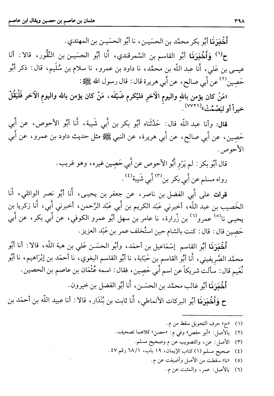 أخبرنا أبو بكر محمد بن الحسين أنا أبو الحسين بن المهتدي ح (1) وأخبرنا أبو القاسم بن السمرقندي أنا أبو الحسين بن النقور قالا أنا عيسى بن علي أنا عبد الله بن محمد نا داود بن عمرو نا سلام بن سليم قال ذكر أبو حصين (2) عن أبي صالح عن أبي هريرة قال قال رسول الله (صلى الله عليه وسلم) من كان يؤمن بالله واليوم الاخر فليكرم ضيفه من كان يؤمن بالله واليوم الآخر فليقل خيرا أو ليصمت قال وأنا عبد الله قال حدثناه أبو بكر بن أبي شيبة أنا أبو الأحوص عن أبي حصين عن أبي صالح عنم أبي هريرة عن النبي (صلى الله عليه وسلم) مثل حديث داود بن عمرو عن أبي الأحوص قال أبو بكر لم يرو أبو الأحوص عن أبي حصين غيره وهو غريب رواه مسلم عن أبي بكر بن (3) أبي شيبة (4) قرأت على أبي الفضل بن ناصر عن جعفر بن يحيى أنا أبو نصر الوائلي أنا الخصيب بن عبد الله أخبرني عبد الكريم بن أبي عبد الرحمن أخبرني أبي أنا زكريا بن يحيى نا (5) عمرو (6) بن زرارة نا عامر بن سهل أبو عمرو الكوفي عن أبي بكر عن أبي حصين قال قال كنت بالشام حين استخلف عمر بن عبد العزيز أخبرنا أبو القاسم إسماعيل بن أحمد وأبو الحسن علي بن هبة الله قالا أنا أبو محمد الصريفيني أنا أبو القاسم بن حبابة نا أبو القاسم البغوي نا أحمد بن إبراهيم نا أبو نعيم قال سألت شريكا عن اسم أبي حصين فقال اسمه عثمان بن عاصم بن الحصين أخبرنا أبو غالب محمد بن الحسن أنا أبو الفضل بن خيرون ح وأخبرنا أبو البركات الأنماطي أنا ثابت بن بندار قالا أنا عبيد الله بن أحمد بن