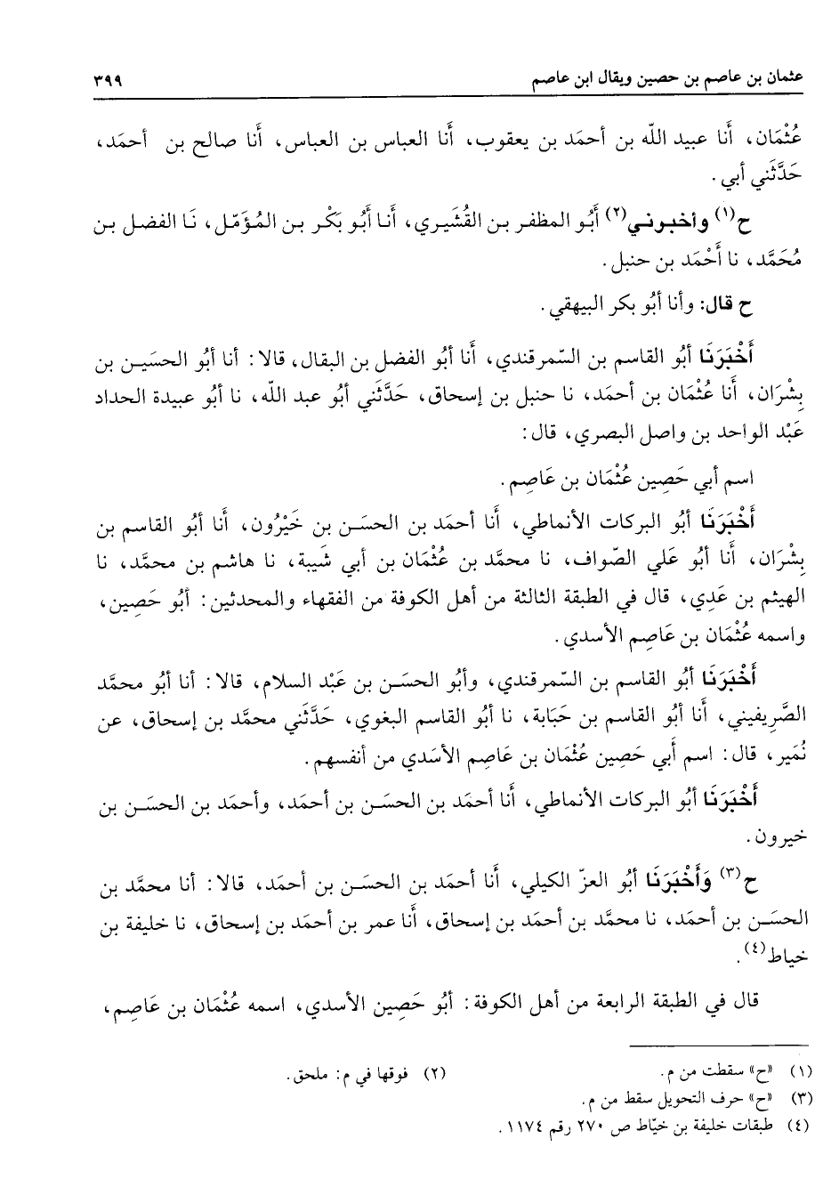 عثمان أنا عبيد الله بن أحمد بن يعقوب أنا العباس بن العباس أنا صالح بن أحمد حدثني أبي ح (1) وأخبرني (2) أبو المظفر بن القشيري أنا أبو بكر بن المؤمل نا الفضل بن محمد نا أحمد بن حنبل ح قال وأنا أبو بكر البيهقي أخبرنا أبو القاسم بن السمرقندي أنا أبو الفضل بن البقال قالا أنا أبو الحسين بن بشران أنا عثمان بن أحمد نا حنبل بن إسحاق حدثني أبو عبد الله نا أبو عبيدة الحداد عبد الواحد بن واصل البصري قال اسم أبي حصين عثمان بن عاصم أخبرنا أبو البركات الأنماطي أنا أحمد بن الحسن بن خيرون أنا أبو القاسم بن بشران أنا أبو علي الصواف نا محمد بن عثمان بن أبي شيبة نا هاشم بن محمد نا الهيثم بن عدي قال في الطبقة الثالثة من أهل الكوفة من الفقهاء والمحدثين أبو حصين واسمه عثمان بن عاصم الأسدي أخبرنا أبو القاسم بن السمرقندي وأبو الحسن بن عبد السلام قالا أنا أبو محمد الصريفيني أنا أبو القاسم بن حبابة نا أبو القاسم البغوي حدثني محمد بن إسحاق عن نمير قال اسم أبي حصين عثمان بن عاصم الأسدي من أنفسهم أخبرنا أبو البركات الأنماطي أنا أحمد بن الحسن بن أحمد وأحمد بن الحسن بن خيرون ح (3) وأخبرنا أبو العز الكيلي أنا أحمد بن الحسن بن أحمد قالا أنا محمد بن الحسن بن أحمد نا محمد بن أحمد بن إسحاق أنا عمر بن أحمد بن إسحاق نا خليفة بن خياط (4) قال في الطبقة الرابعة من أهل الكوفة أبو حصين الأسدي اسمه عثمان بن عاصم