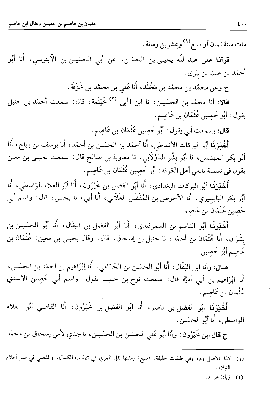 مات سنة ثمان أو تسع (1) وعشرين ومائة قرأنا على عبد الله يحيى بن الحسن عن أبي الحسين ب الآبنوسي أنا أبو أحمد بن عبيد بن بيري ح وعن محمد بن محمد بن مخلد أنا علي بن محمد بن خزفة قالا أنا محمد بن الحسين نا ابن أبي (2) خيثمة قال سمعت أحمد بن حنبل يقول أبو حصين عثمان بن عاصم قال وسمعت أبي يقول أبو حصين عثمان بن عاصم أخبرنا أبو البركات الأنماطي أنا أحمد بن الحسن بن أحمد أنا يوسف بن رباح أنا أبو بكر المهندس نا أبو بشر الدولابي نا معاوية بن صالح قال سمعت يحيى بن معين يقول في تسمية تابعي أهل الكوفة أبو حصين عثمان بن عاصم أخبرنا أبو البركات البغدادي أنا أبو الفضل بن خيرون أنا أبو العلاء الواسطي أنا أبو بكر البابسيري أنا الأحوص بن المفضل الغلابي أنا أبي نا يحيى قال واسم أبي حصين عثمان بن عاصم أخبرنا أبو القاسم بن السمرقندي أنا أبو الفضل بن البقال أنا أبو الحسين بن بشران أنا عثمان بن أحمد نا حنبل بن إسحاق قال وقال يحيى بن معين عثمان بن عاصم أبو حصين قال وأنا ابن البقال أنا أبو الحسن بن الحمامي أنا إبراهيم بن أحمد بن الحسن أنا إبراهيم بن ابي أمية قال سمعت نوح بن حبيب يقول واسم أبي حصين الأسدي عثمان بن عاصم أخبرنا أبو الفضل بن ناصر أنا أبو الفضل بن خيرون أنا القاضي أبو العلاء الواسطي أنا أبو الحسن ح قال ابن خيرون وأنا أبو علي الحسن بن الحسين نا جدي لأمي إسحاق بن محمد