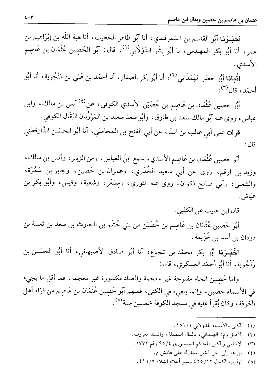 أخبرنا أبو القاسم السمرقندي أنا أبو طاهر الخطيب أنا هبة الله بن إبراهيم بن عمر أنا أبو بكر المهندس نا أبو بشر الدولابي (1) قال أبو الحصين عثمان بن عاصم الأسدي أنبأنا أبو جعفر الهمذاني (2) أنا أبو بكر الصفار أنا أحمد بن علي بن منجوية أنا أبو أحمد قال (3) أبو حصين عثمان بن عاصم بن حصين الأسدي الكوفي عن (4) أنس بن مالك وابن عباس روى عنه أبو مالك سعد بن طارق وأبو سعد سعيد بن المرزبان البقال الكوفي قرأت على أبي غالب بن البنا عن أبي الفتح بن المحاملي أنا أبو الحسن الدارقطني قال أبو حصين عثمان بن عاصم الأسدي سمع ابن العباس ومن الزبير وأنس بن مالك وزيد بن أرقم روى عن أبي سعيد الخدري وعمران بن حصين وجابر بن سمرة والشعبي وأبي صالح ذكوان روى عنه الثوري ومسعر وشعبة وقيس وأبو بكر بن عياش قال ابن حبيب عن الكلبي أبو حصين عثمان بن عاصم بن حصين من بني جشم بن الحارث بن سعد بن ثعلبة بن دودان بن أسد بن خزيمة أخبرنا أبو بكر محمد بن شجاع أنا أبو صادق الأصبهاني أنا أبو الحسن بن زنجوية أنا أبو أحمد العسكري قال وأما حصين الحاء مفتوحة غير معجمة والصاد مكسورة غير معجمة فما أقل ما يجئ في الأسماء حصين وإنما يجئ في الكنى فمنهم أبو حصين عثمان بن عاصم من قراء أهل الكوفة وكان يقرأ عليه في مسجد الكوفة خمسين سنة (5)