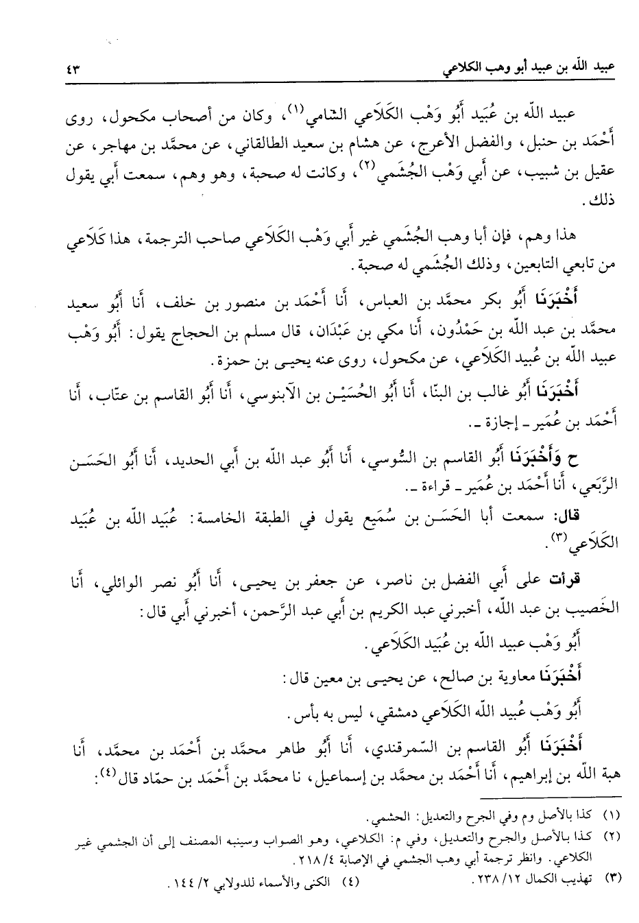 عبيد الله بن عبيد أبو وهب الكلاعي الشامي (1) وكان من أصحاب مكحول روى أحمد بن حنبل والفضل الأعرج عن هشام بن سعيد الطالقاني عن محمد بن مهاجر عن عقيل بن شبيب عن أبي وهب الجشمي (2) وكانت له صحبة وهو وهم سمعت أبي يقول ذلك هذا وهم فإن أبا وهب الجشمي غير أبي وهب الكلاعي صاحب الترجمة هذا كلاعي من تابعي التابعين وذلك الجشمي له صحبة أخبرنا أبو بكر محمد بن العباس أنا أحمد بن منصور بن خلف أنا أبو سعيد محمد بن عبد الله بن حمدون أنا مكي بن عبدان قال مسلم بن الحجاج يقول أبو وهب عبيد الله بن عبيد الكلاعي عن مكحول روى عنه يحيى بن حمزة أخبرنا أبو غالب بن البنا أنا بن الحسين بن الآبنوسي أنا أبو القاسم بن عتاب أنا أحمد بن عمير إجازة ح وأخبرنا أبو القاسم بن السوسي أنا أبو عبد الله بن أبي الحديد أنا أبو الحسن الربعي أنا أحمد بن عمير قراءة قال سمعت أبا الحسن بن سميع يقول في الطبقة الخامسة عبيد الله بن عبيد الكلاعي (3) قرأت على أبي الفضل بن ناصر عن جعفر بن يحيى أنا أبو نصر الوائلي أنا الخصيب بن عبد الله أخبرني عبد الكريم بن أبي عبد الرحمن أخبرني أبي قال أبو وهب عبيد الله بن عبيد الكلاعي أخبرنا معاوية بن صالح عن يحيى بن معين قال أبو وهب عبيد الله الكلاعي دمشقي ليس به بأس أخبرنا أبو القاسم بن السمرقندي أنا أبو طاهر محمد بن أحمد بن محمد أنا هبة الله بن إبراهيم أنا أحمد بن محمد بن إسماعيل نا محمد بن أحمد بن حماد قال (4) :