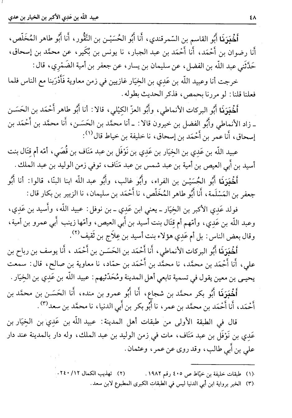 أخبرنا أبو القاسم بن السمرقندي أنا أبو الحسين بن النقور أنا أبو طاهر المخلص أنا رضوان بن أحمد أنا أحمد بن عبد الجبار نا يونس بن بكير عن محمد بن إسحاق حدثني عبد الله بن الفضل عن سليمان بن يسار عن جعفر بن أمية الضمري قال خرجت أنا وعبيد الله بن عدي الخيار غازيين في زمن معاوية فأدربنا مع الناس فلما فعلنا قلنا لو مررنا بحمص فذكر الحديث بطوله أخبرنا أبو البركات الأنماطي وأبو العز الكيلي قالا أنا أبو طاهر أحمد بن الحسن زاد الأنماطي وأبو الفضل بن خيرون قالا أنا محمد بن الحسن أنا محمد بن أحمد بن إسحاق أنا عمر بن أحمد بن إسحاق نا خليفة بن خياط قال (1) عبيد الله بن عدي الخيار بن عدي بن نوفل بن عبد مناف بن قصي أمه أم قتال بنت أسيد بن أبي العيص بن أمية بن عبد شمس بن عبد مناف توفى زمن الوليد بن عبد الملك أخبرنا أبو الحسين بن الفراء وأبو غالب وأبو عبد الله ابنا البنا قالوا أنا أبو جعفر بن المسلمة أنا أبو طاهر المخلص نا أحمد بن سليمان نا الزبير بن بكار قال فولد عدي الأكبر بن الخيار يعني ابن عدي بن نوفل عبيد الله وأسيد بن عدي وعبد الله بن عدي وأمهم أم قتال بنت أسيد بن أبي العيص وأمها زينب أبي عمرو بن أمية وقال بعض الناس بل أم عدي هؤلاء بنت أسيد بن علاج بن ثقيف (2) أخبرنا أبو البركات الأنماطي أنا أحمد بن الحسن بن أحمد أنا يوسف بن رباح بن علي أنا أحمد بن محمد نا محمد بن أحمد بن حماد نا معاوية بن صالح قال سمعت يحيى بنمعين يقول في تسمية تابعي أهل المدينة ومحدثيهم عبيد الله بن عدي بن الخيار أخبرنا أبو بكر محمد بن شجاع أنا أبو عمرو بن منده أنا الحسن بن محمد بن أحمد أنا أحمد بن محمد بن عمر نا أبو بكر بن أبي الدنيا نا محمد بن سعد (3) قال في الطبقة الأولى من طبقات أهل المدينة عبيد الله بن عدي بن الخيار بن عدي بن نوفل بن عبد مناف مات زمن الوليد بن عبد الملك وله دار بالمدينة عند دار علي بن أبي طالب وقد روى عن عمر وعثمان