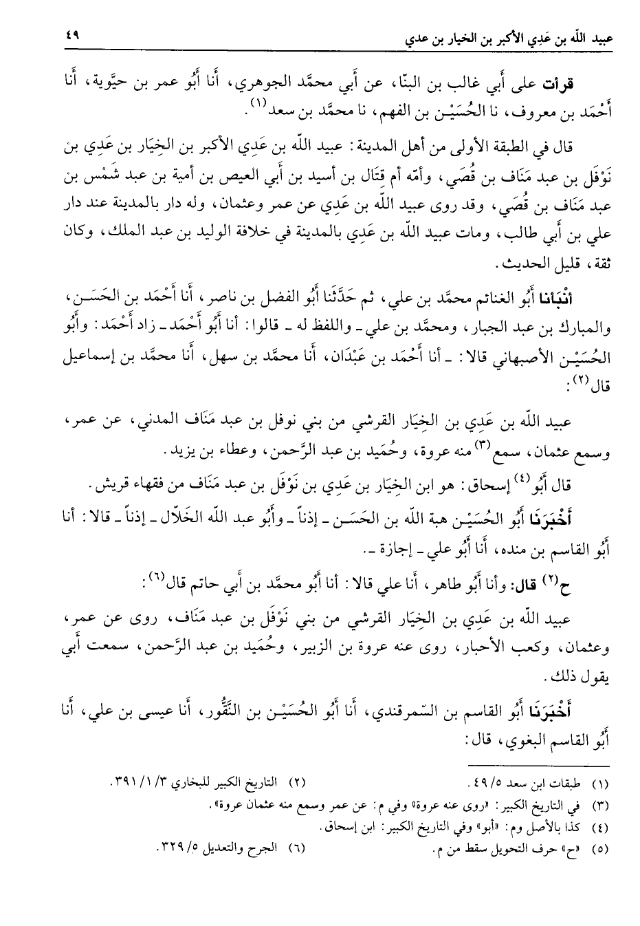 قرأت على أبي غالب بن البنا عن أبي محمد الجوهري أنا أبو عمر بن حيوية أنا أحمد بن معروف نا الحسين بن الفهم أنا محمد بن سعد (1) قال في الطبقة الأولى من أهل المدينة عبيد الله بن عدي الأكبر بن الخيار بن عدي بن نوفل بن عبد مناف بن قصي وأمه أم قتال بن أسيد بن أبي العيص بن أمية بن عبد شمس بن عبد مناف بن قصي وقد روى عبيد الله بن عدي عن عمر وعثمان وله دار بالمدينة عند دار علي بن أبي طالب ومات عبيد الله بن عدي بالمدينة في خلافة الوليد بن عبد الملك وكان ثقة قليل الحديث أنبأنا أبو الغنائم محمد بن علي ثم حدثنا أبو الفضل بن ناصر أنا أحمد بن الحسن والمبارك بن عبد الجبار ومحمد بن علي واللفظ له قالوا أنا أبو أحمد زاد أحمد وأبو الحسين الأصبهاني قالا أنا أحمد بن عبدان أنا محمد بن سهل أنا محمد بن إسماعيل قال (2) عبيد الله بن عدي بن الخيار القرشي من بني نوفل بن عبد مناف المدني عن عمر وسمع عثمان سمع (3) منع عروة وحميد بن عبد الرحمن وعطاء بن يزيد قال أبو (4) إسحاق هو ابن الخيار بن عدي بن نوفل بن عبد مناف من فقهاء قريش أخبرنا أبو الحسين هبة الله بن الحسن إذنا وأبو عبد الله الخلال إذنا قالا أنا أبو القاسم بن منده أنا أبو علي إجازة ح (2) قال وأنا أبو طاهر أنا علي قالا أنا أبو محمد بن أبي حاتم قال (6) عبيد الله بن عدي بن الخيار القرشي من بني نوفل بن عبد مناف روى عن عمر وعثمان وكعب الأحبار روى عنه عروة بن الزبير وحميد بن عبد الرحمن سمعت أبي يقول ذلك أخبرنا أبو القاسم بن السمرقندي أنا أبو الحسين بن النقور أنا عيسى بن علي أنا أبو القاسم البغوي قال: