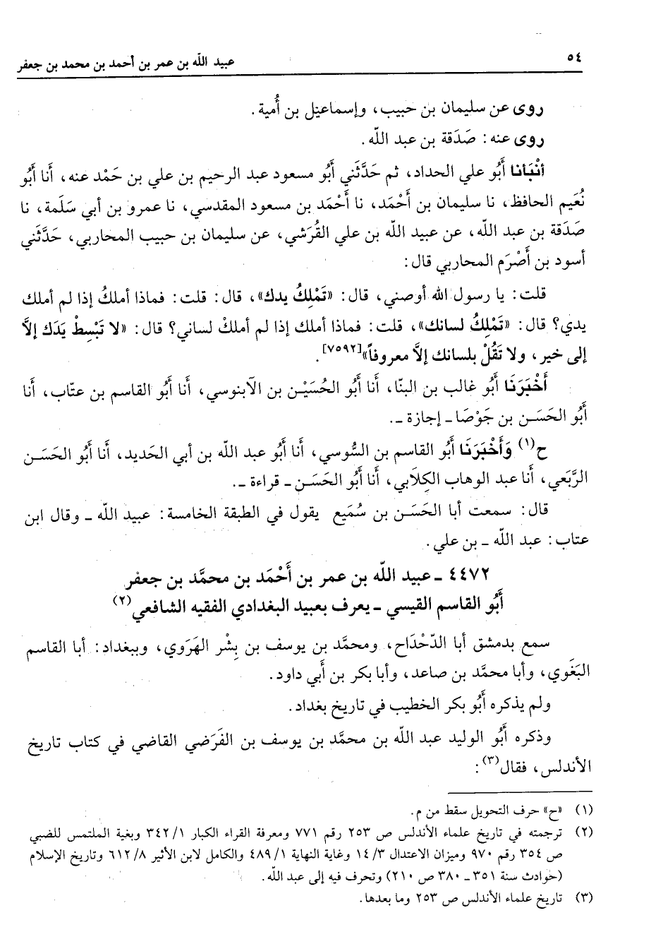 [7592] أخبرنا أبو غالب بن البنا أنا أبو الحسين بن الآبنوسي أنا أبو القاسم بن عتاب أنا أبو الحسن بن جوصا إجازة ح (1) وأخبرنا أبو القاسم بن السوسي أنا أبو عبد الله بن أبي الحديد أنا أبو الحسن الربعي أنا عبد الوهاب الكلابي أنا أبو الحسن قراءة قال سمعت أبا الحسن بن سميع يقول في الطبقة الخامسة عبيد الله وقال ابن عتاب عبد الله بن علي 4472 - عبيد الله بن عمر بن أحمد بن محمد بن جعفر أبو القاسم القيسي يعرف بعبيد البغدادي الفقيه الشافعي (2) سمع بدمشق أبا الدحداح ومحمد بن يوسف بن بشر الهروي وببغداد أبا القاسم البغوي وأبا محمد بن صاعد وأبا بكر بن أبي داود ولم يذكره أبو بكر الخطيب في تاريخ بغداد وذكره أبو الوليد عبد الله بن محمد بن يوسف بن الفرضي القاضي في كتاب تاريخ الأندلس فقال (3)