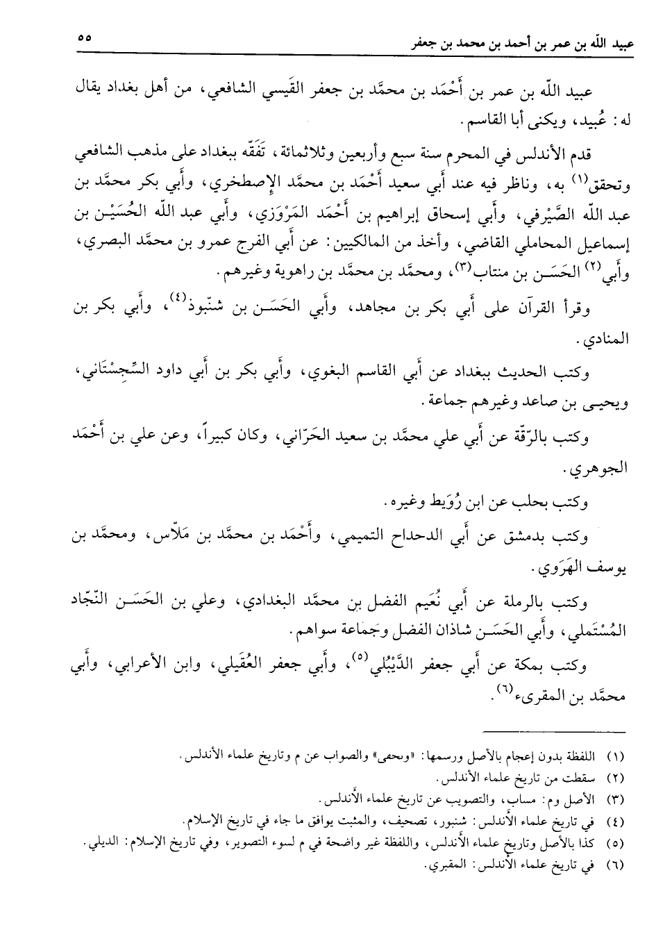 عبيد الله بن عمر بن أحمد بن محمد بن جعفر القيسي الشافعي من أهل بغداد يقال له عبيد ويكنى أبا القاسم قدم الأندلس في المحرم سنة سبع وأربعين وثلاثمائة تفقه ببغداد على مذهب الشافعي وتحقق (1) به وناظر فيه عند أبي سعيد أحمد بن محمد الإصطخري وأبي بكر محمد بن عبد الله الصيرفي وأبي إسحاق إبراهيم بن أحمد المروزي وأبي عبد الله الحسين بن إسماعيل المحاملي القاضي وأخذ من المالكيين عن أبي الفرج عمرو بن محمد البصري وأبي (2) الحسن بن منتاب (3) ومحمد بن محمد بن راهوية وغيرهم وقرأ القرآن على أبي بكر بن مجاهد وأبي الحسن بن شنبوذ (4) وأبي بكر بن المنادي وكتب الحديث ببغداد عن أبي القاسم البغوي وأبي بكر بن أبي داود السجستاني ويحيى بن صاعد وغيرهم جماعة وكتب بالرقة عن أبي علي محمد بن سعيد الحراني وكان كبيرا وعن علي بن أحمد الجوهري وكتب بحلب عن ابن رويط وغيره وكتب بدمشق عن أبي الدحداح التميمي وأحمد بن محمد بن ملاس ومحمد بن يوسف الهروي وكتب بالرملة عن أبي نعيم الفضل بن محمد البغدادي وعلي بن الحسن النجاد المستملي وأبي الحسن شاذان الفضل وجماعة سواهم وكتب بمكة عن أبي جعفر الديبلي (5) وأبي جعفر العقيلي وابن الأعرابي وأبي محمد بن المقرئ (6)