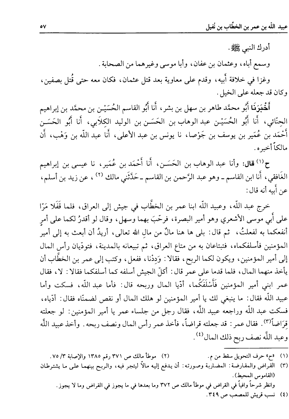 أدرك النبي (صلى الله عليه وسلم) وسمع أباه وعثمان بن عفان وأبا موسى وغيرهما من الصحابة وغزا في خلافة أبيه وقدم على معاوية بعد قتل عثمان فكان معه حتى قتل بصفين وكان قد جعله على الخيل أخبرنا أبو محمد طاهر بن سهل بن بشر أنا أبو القاسم الحسين بن محمد بن إبراهيم الحنائي أنا أبو الحسين عبد الوهاب بن الحسن بن الوليد الكلابي أنا أبو الحسن أحمد بن عمير بن يوسف بن جوصا نا يونس بن عبد الأعلى أنا عبد الله بن وهب أن مالكا أخبره ح (1) قال وأنا عبد الوهاب بن الحسن أنا أحمد بن عمير نا عيسى بن إبراهيم الغافقي أنا ابن القاسم وهو عبد الرحمن بن القاسم حدثني مالك (2) عن زيد بن أسلم عن أبيه أنه قال خرج عبد الله وعبيد الله ابنا عمر بن الخطاب في جيش العراق فلما قفلا مرا على أبي موسى الأشعري وهو أمير البصرة فرحب بهما وسهل وقال لو قدر لكما على أمر أنفعكما به لفعلت ثم قال بلى ها هنا مال من مال الله تعالى أريد أن أبعث به إلى أمير المؤمنين فأسلفكماه فتبتاعان به من متاع العراق ثم تبيعانه بالمدينة فتوديان رأس المال إلى أمير المؤمنين ويكون لكما الربح فقالا وددنا ففعل وكتب إلى عمر بن الخطاب أن يأخذ منهما المال فلما قدما على عمر قال أكل الجيش أسلفه كما أسلفكما فقالا لا فقال عمر ابني أمير المؤمنين فأسلفكما أديا المال وربحه قال فأما عبد الله فسكت وأما عبيد الله فقال ما ينبغي لك يا أمير المؤمنين لو هلك المال أو نقص لضمناه فقال أدياه فسكت عبد الله وراجعه عبيد الله فقال رجل من جلساء عمر يا أمير المؤمنين لو جعلته قراضا (3) فقال عمر قد جعلته قراضا فأخذ عمر رأس المال ونصف ربحه وأخذ عبيد الله وعبد الله نصف ربح ذلك المال (4)