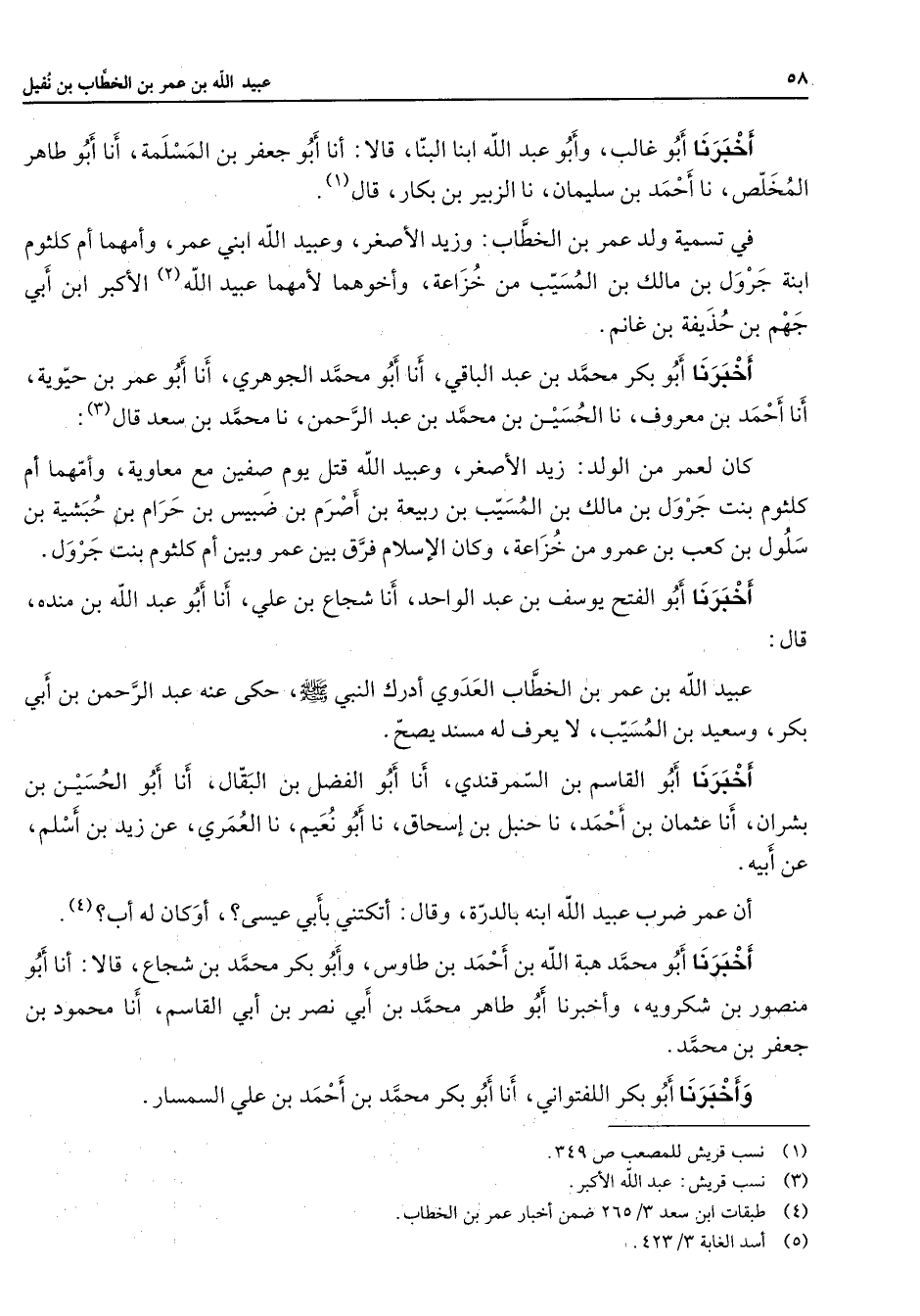 أخبرنا أبو غالب وأبو عبد الله ابنا البنا قالا أنا أبو جعفر بن المسلمة أنا أبو طاهر المخلص نا أحمد بن سليمان نا الزبير بن بكار قال (1) في تسمية ولد عمر بن الخطاب وزيد الأصغر وعبيد الله ابني عمر وأمهما أم كلثوم ابنة جرول بن مالك بن المسيب من خزاعة وأخوهما لأمهما عبيد الله (2) الأكبر ابن أبي جهم بن حذيفة بن غانم أخبرنا أبو بكر محمد بن عبد الباقي أنا أبو محمد الجوهري أنا أبو عمر بن حيوية أنا أحمد بن معروف نا الحسين بن محمد بن عبد الرحمن نا محمد بن سعد قال (3) كان لعمر من الولد زيد الأصغر وعبيد الله قتل يوم صفين مع معاوية وأمهما أم كلثوم بنت جرول بن مالك بن المسيب بن ربيعة بن أصرم بن ضبيس بن حرام بن حبشية بن سلول بن كعب بن عمرو من خزاعة وكان الإسلام فرق بين عمر وبين أم كلثوم بنت جرول أخبرنا أبو الفتح يوسف بن عبد الواحد أنا شجاع بن علي أنا عبد الله بن منده قال عبيد الله بن عمر بن الخطاب العدوي أدرك النبي (صلى الله عليه وسلم حكى عنه عبد الرحمن بن أبي بكر وسعيد بن المسيب لا يعرف له مسند يصح أخبرنا أبو القاسم بن السمرقندي أنا أبو الفضل بن البقال أنا أبو الحسين بن بشران أنا عثمان بن أحمد نا حنبل بن إسحاق نا أبو نعيم نا العمري عن زيد بن أسلم عن أبيه أن عمر ضرب عبيد الله ابنه بالدرة وقال أتكتني بأبي عيسى أو كان له أب (4) أخبرنا أبو محمد هبة الله بن أحمد بن طاوس وأبو بكر محمد بن شجاع قالا أنا أبو منصور بن شكروية وأخبرنا أبو طاهر محمد بن أبي نصر بن أبي القاسم أنا محمود بن جعفر بن محمد وأخبرنا أبو بكر اللفتواني أنا أبو بكر محمد بن أحمد بن علي السمسار