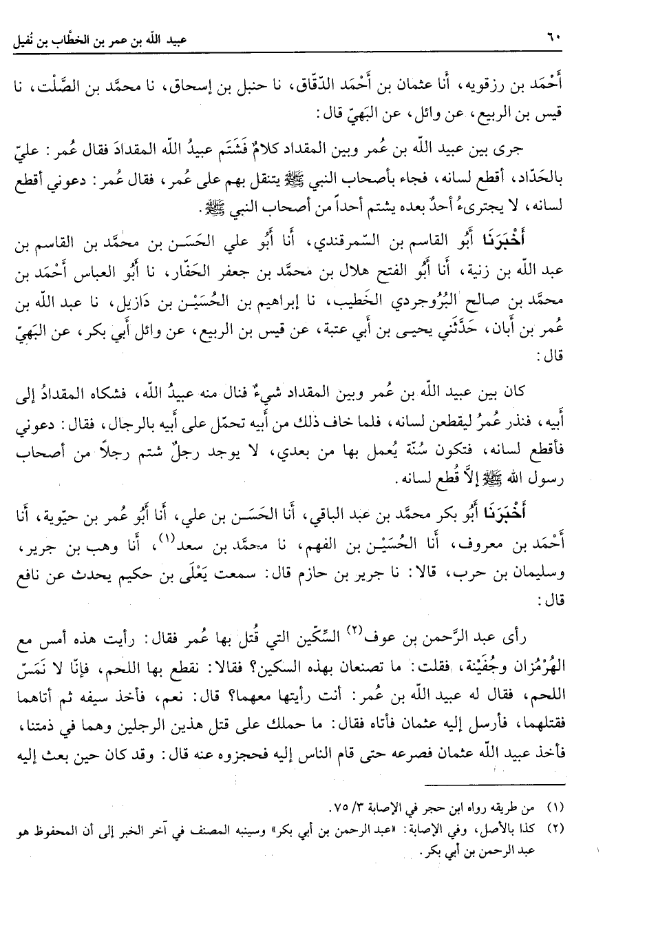 أحمد بن رزقوية أنا عثمان بن أحمد الدقاق نا حنبل بن إسحاق نا محمد بن الصلت نا قيس بن الربيع عن وائل عن البهي قال جرى بين عبيد الله بن عمر وبين المقداد كلام فشتم عبيد الله المقداد فقال عمر علي بالحداد أقطع لسانه فجاء بأصحاب النبي (صلى الله عليه وسلم) يتنقل بهم على عمر فقال عمر دعوني أقطع لسانه لا يجترئ أحد بعده يشتم أحدا من أصحاب النبي (صلى الله عليه وسلم) أخبرنا أبو القاسم بن السمرقندي أنا أبو علي الحسن بن محمد بن القاسم بن عبد الله بن زينه أنا أبو الفتح هلال بن محمد بن جعفر الحفار نا أبو العباس أحمد بن محمد بن صالح البروجردي الخطيب نا إبراهيم بن الحسين بن دازيل نا عبد الله بن عمر بن أبان حدثني يحيى بن أبي عتبة عن قيس بن الربيع عن وائل أبي بكر عن البهي قال كان بين عبيد الله بن عمر وبين المقداد شئ فنال منه عبيد الله فشكاه المقداد إلى أبيه فنذر عمر ليقطعن لسانه فلما خاف ذلك من أبيه تحمل على أبيه بالرجال فقال دعوني فأقطع لسانه فتكون سنة يعمل بها من بعدي لا يوجد رجل شتم رجلا من أصحاب رسول الله (صلى الله عليه وسلم) إلا قطع لسانه أخبرنا أبو بكر محمد بن عبد الباقي أنا الحسن بن علي أنا أبو عمر بن حيوية أنا أحمد بن معروف أنا الحسين بن الفهم نا محمد بن سعد (1) أنا وهب بن جرير وسليمان بن حرب قالا نا جرير بن حازم قال سمعت يعلى بن حكيم يحدث عن نافع قال رأى عبد الرحمن بن عوف (2) السكين التي قتل بها عمر فقال رأيت هذه أمس مع الهرمزان وجفينه فقلت ما تصنعان بهذه السكين فقالا نقطع بها اللحم فإنا لا نمس اللحم فقال له عبيد الله بن عمر أنت رأيتها معهما قال نعم فأخذ سيفه ثم أتاهما فقتلهما فأرسل إليه عثمان فأتاه فقال ما حملك على قتل هذين الرجلين وهما في ذمتنا فأخذ عبيد الله عثمان فصرعه حتى قام الناس إليه فحجزوه عنه قال وقد كان حين بعث إليه