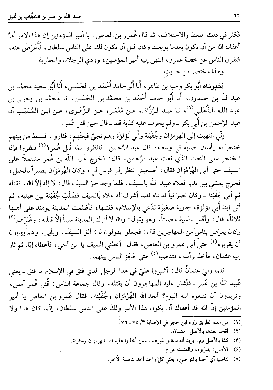 فكثر في ذلك اللغط والاختلاف ثم قال عمرو بن العاص يا أمير المؤمنين إن هذا الأمر أمر أعفاك الله من أن يكون بعدما بويعت وكان قبل أن يكون لك على الناس سلطان فأعرض عنه فتفرق الناس عن خطبة عمرو انتهى إليه أمير المؤمنين وودي الرجلان والجارية وهذا مختصر من حديث أخبرناه أبو بكر وجيه بن طاهر أنا أبو حامد بن الحسن أنا أبو سعيد محمد بن عبد الله بن حمدون أنا أبو حامد أحمد بن محمد بن الحسن نا محمد بن يحيى بن عبد الله الذهلي (1) نا عبد الرزاق عن معمر عن الزهري عن ابن المسيب أن عبد الرحمن بن أبي بكر ولم يجرب عليه كذبة قط قال حين قتل عمر إني انتهيت إلى الهرمزان وجفينة وأبي لؤلؤة وهم نجي فبغتهم فثاروا فسقط من بينهم خنجر له رأسان نصابه في وسطه قال عبد الرحمن فانظروا بما قتل عمر (2) فنظروا فإذا الخنجر على النعت الذي نعت عبد الرحمن قال فخرج عبيد الله بن عمر مشتملا على السيف حتى أتى الهرمزان فقال أصحبني تنظر إلى فرس لي وكان الهرمزان بصيرا بالخيل فخرج يمشي بين يديه فعلاه عبيد الله بالسيف فلما وجد حر السيف قال لا إله إلا الله فقتله ثم أتى جفينة وكان نصرانيا فدعاه فلما أشرف له علاه بالسيف فصلب جفينة بين عينيه ثم أتى ابنة أبي لؤلؤة جارية صغيرة تدعي بالإسلام فقتلها فأظلمت المدينة يومئذ على أهلها ثلاثا قال وأقبل بالسيف صلتا وهو يقول والله لا أترك بالمدينة سبيا إلا قتلته وغيرهم (3) وكان يعرض بناس من المهاجرين قال فجعلوا يقولون له ألق السيف ويأبى وهم يهابون أن يقربوه (4) حتى أتى عمرو بن العاص فقال أعطني السيف يا ابن أخي فأعطاه إياه ثم ثار إليه عثمان فأخذ برأسه فتناصيا (5) حتى حجز الناس بينهم فلما ولي عثمان قال أشيروا علي في هذا الرجل الذي فتق في الإسلام ما فتق يعني عبيد الله بن عمر فأشار عليه المهاجرون أن يقتله وقال جماعة من الناس قتل عمر أمس وتريدون أن تتبعوه ابنه اليوم أبعد الله الهرمزان وجفينة فقال عمرو بن العاص يا أمير المؤمنين إن الله قد أعفاك أن يكون هذا الأمر ولك على الناس سلطان إنما كان هذا ولا